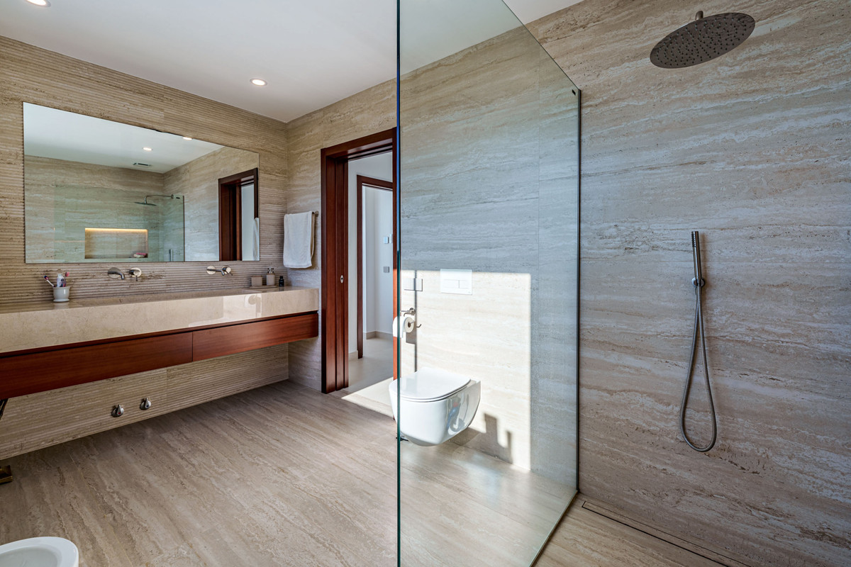 The exterior features clean architectural lines, natural stone finishes, and large floor-to-ceiling windows that flood the interior with natural light and frame views of the sea and mountains. Located in a peaceful area, the villa offers a pleasant sense of privacy. The ground floor includes two bedrooms, each with an en-suite bathroom, sea views, and direct access to the garden. This level also features a versatile room—ideal for use as a gym, storage space, or hobby area—as well as a separate laundry room. There is also a garage with space for 4 vehicles.