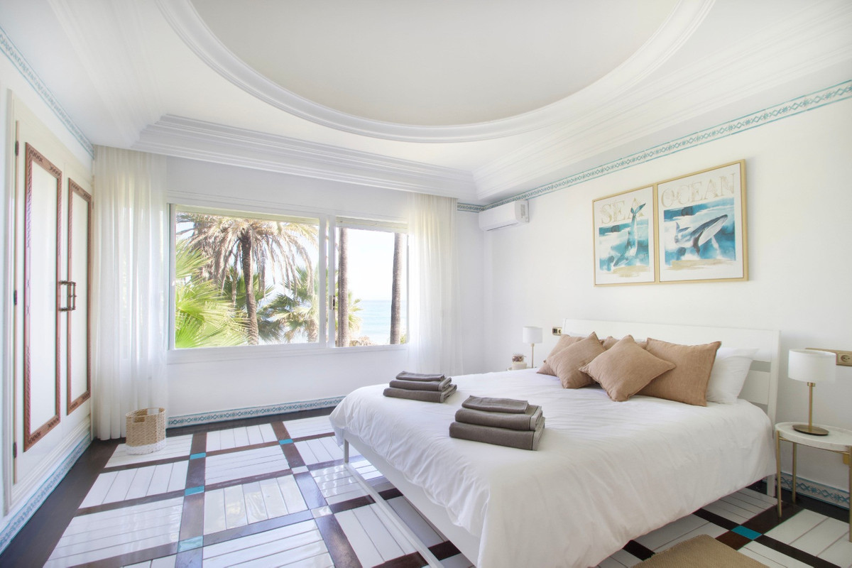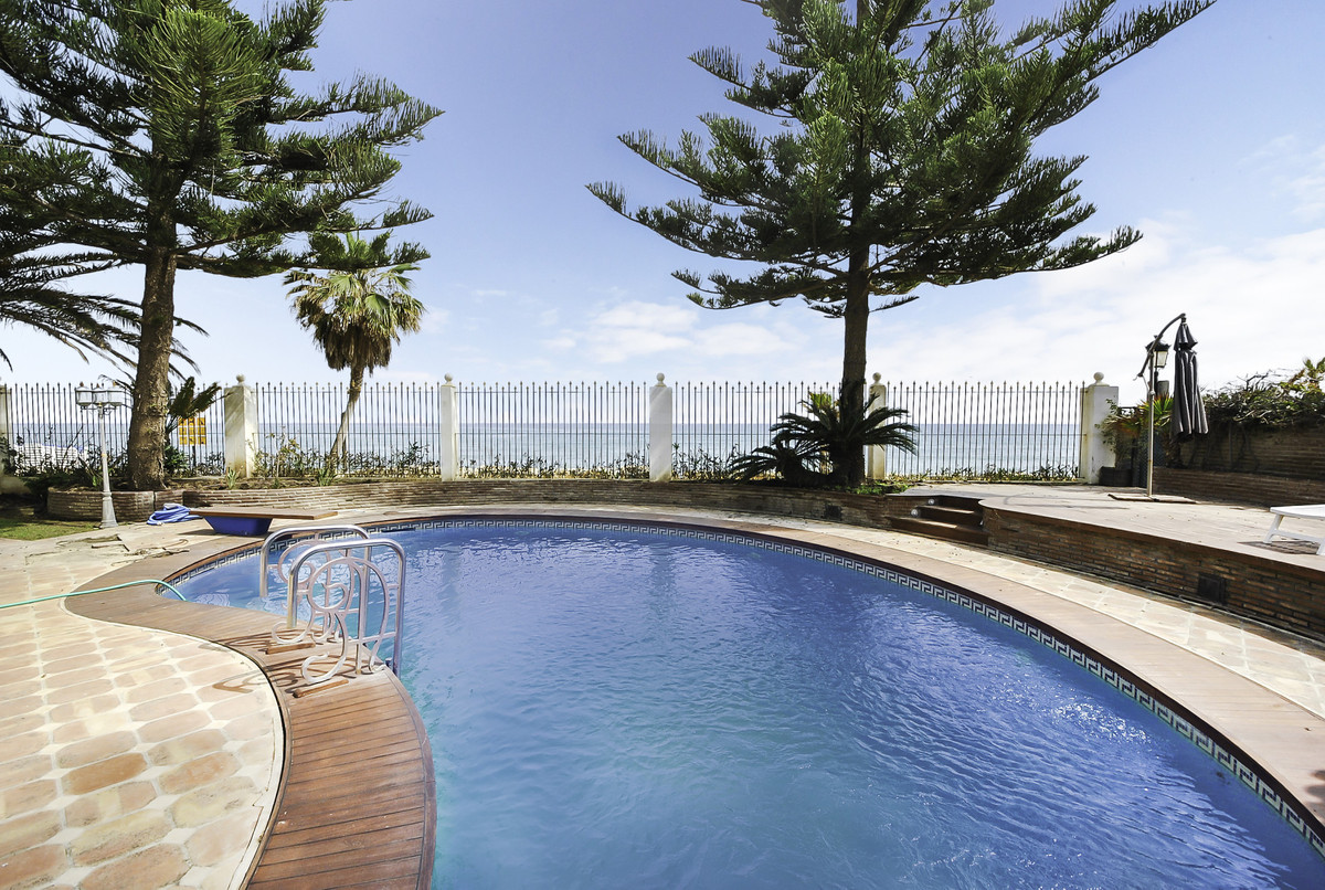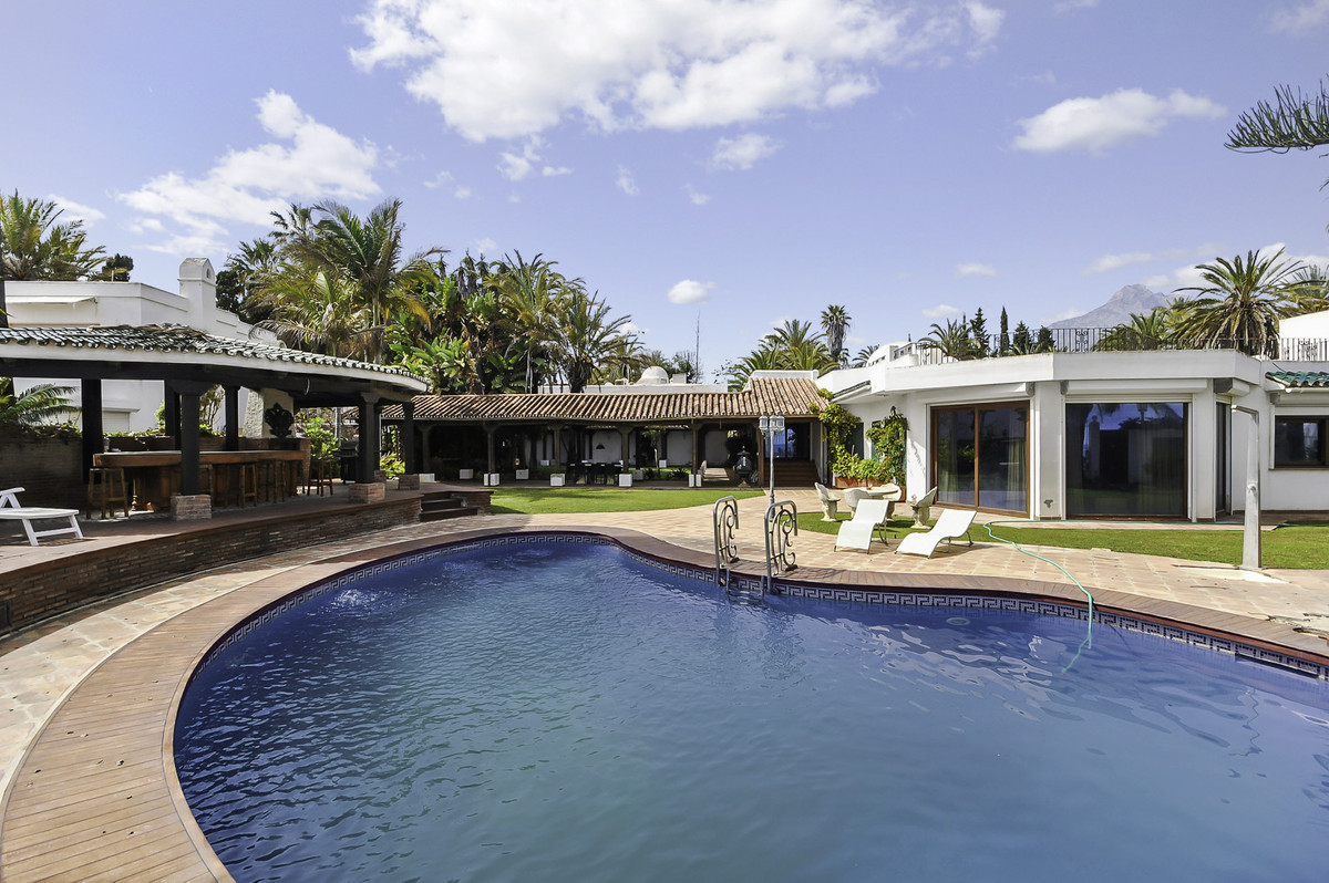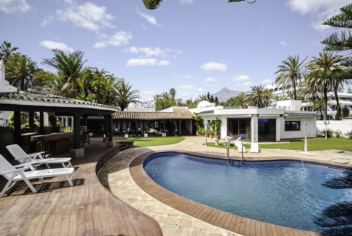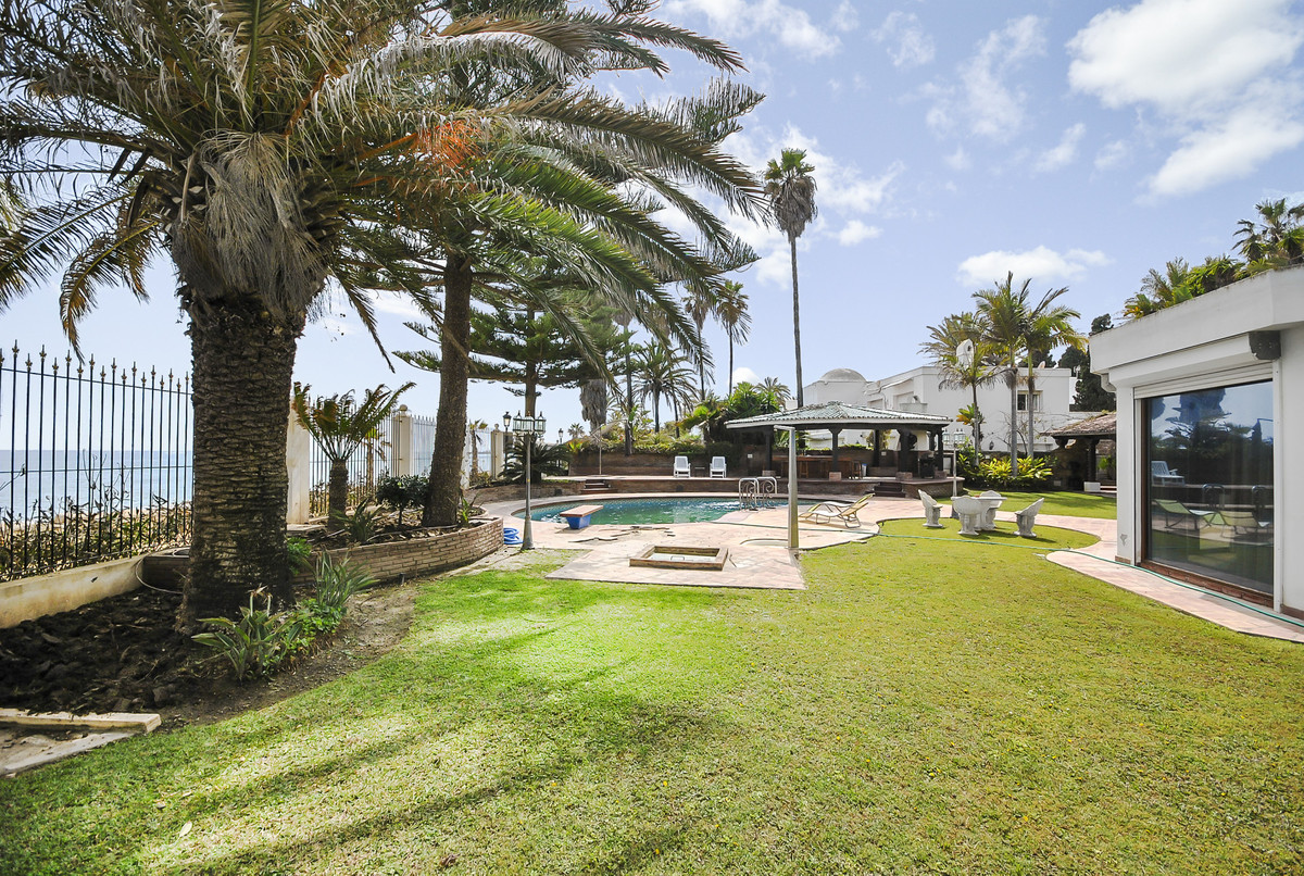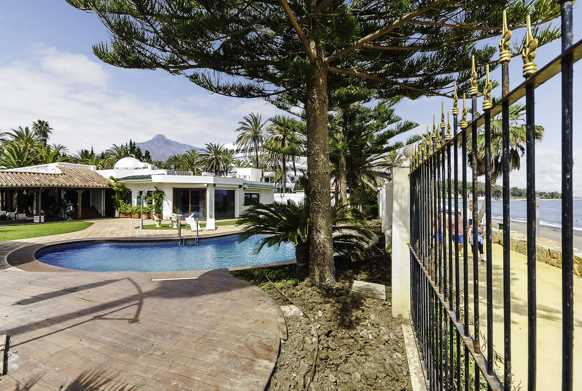 A very spacious & unique villa situated in an unrivalled front line beach position in one of Spain's most privileged location, Marbella's exclusive Golden Mile. The villa is set on a double plot and offers on the ground level an entry hall, a guest toilet, office,  spacious living room leading onto the garden with various terraces, swimming pool, bar, and direct access to the promenade. On this floor there is a separate dining room with vaulted skylight ceiling, a fully equipped kitchen with separate entrance, the master suite with walking wardrobes, 2 further double en suite bedrooms, and 2 bedrooms sharing a bathrooms. On this level there are two self contained guest apartments with 2 bedroom suites and living area, as well as a garage for four cars. These apartments are accessed separately form the main house. On this level we will also find a separate area with cinema room, an industrial kitchen with storeroom and 2 toilets.