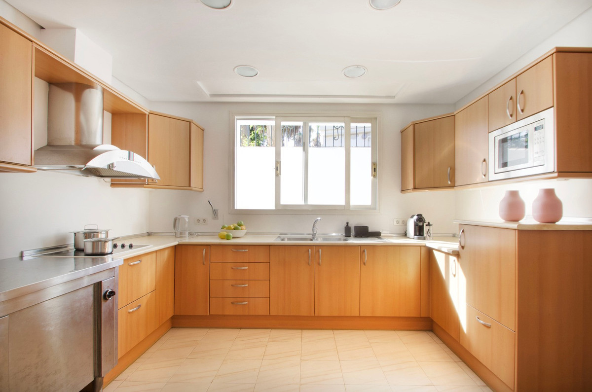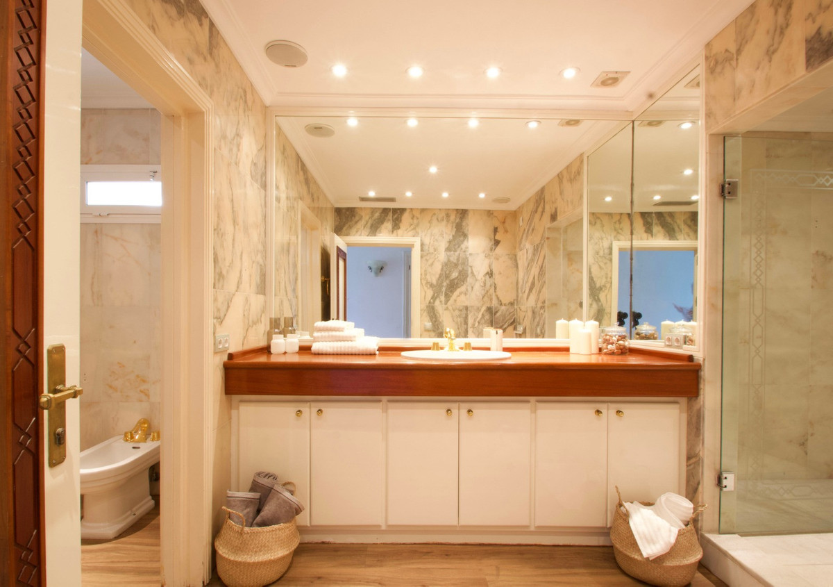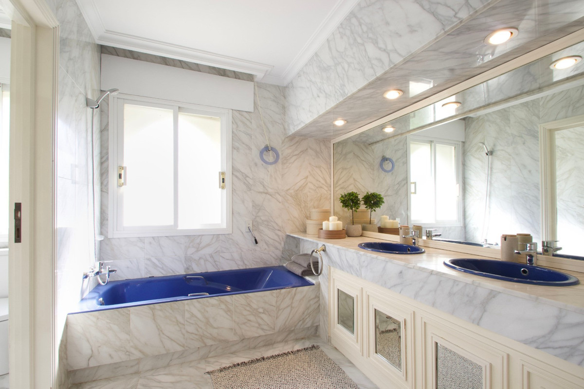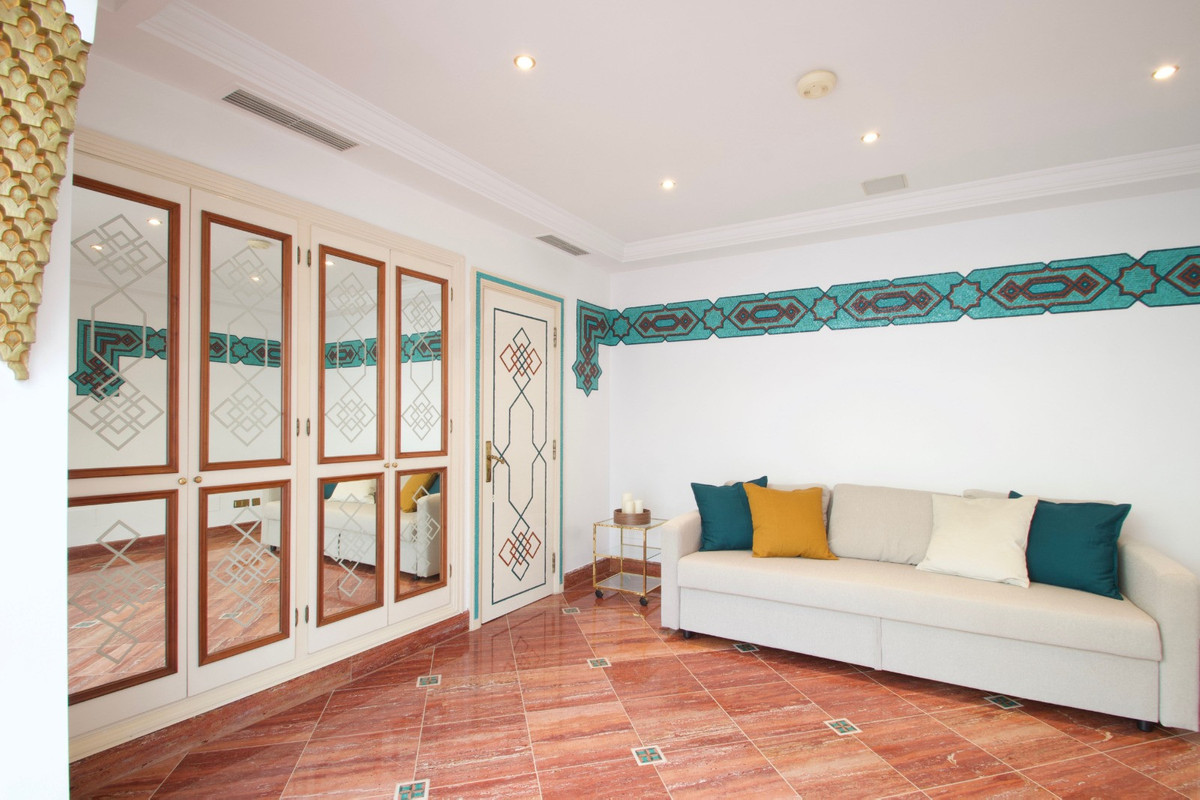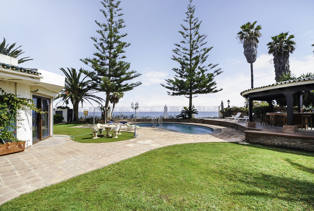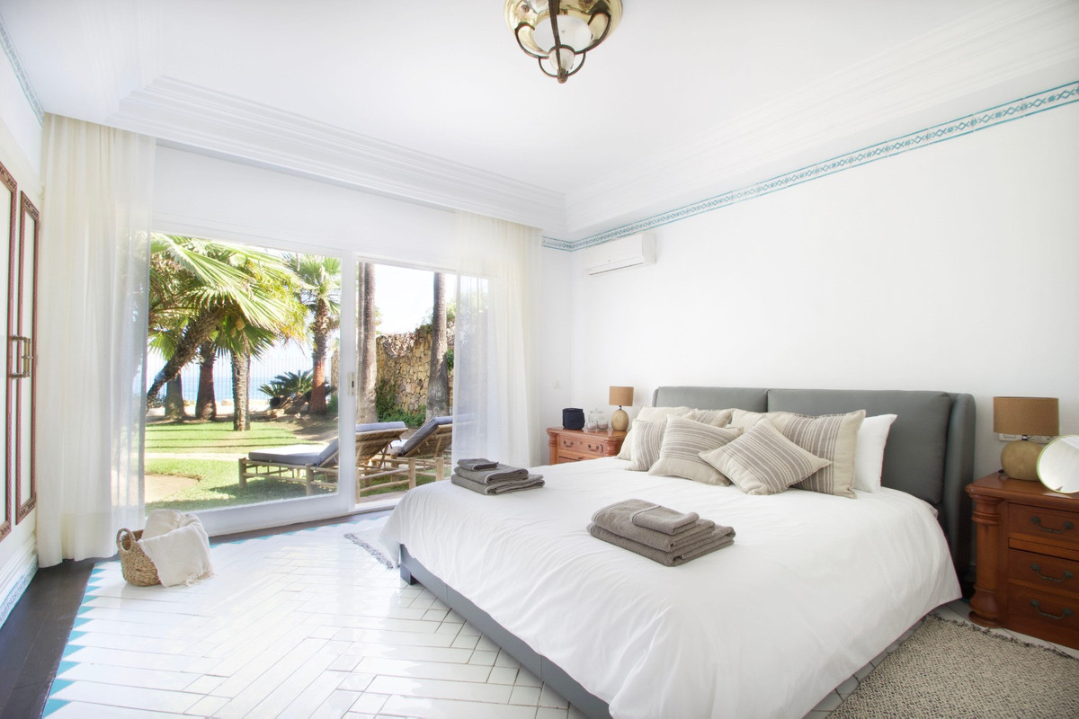 A very spacious & unique villa situated in an unrivalled front line beach position in one of Spain's most privileged location, Marbella's exclusive Golden Mile. The villa is set on a double plot and offers on the ground level an entry hall, a guest toilet, office,  spacious living room leading onto the garden with various terraces, swimming pool, bar, and direct access to the promenade. On this floor there is a separate dining room with vaulted skylight ceiling, a fully equipped kitchen with separate entrance, the master suite with walking wardrobes, 2 further double en suite bedrooms, and 2 bedrooms sharing a bathrooms. On this level there are two self contained guest apartments with 2 bedroom suites and living area, as well as a garage for four cars. These apartments are accessed separately form the main house. On this level we will also find a separate area with cinema room, an industrial kitchen with storeroom and 2 toilets.