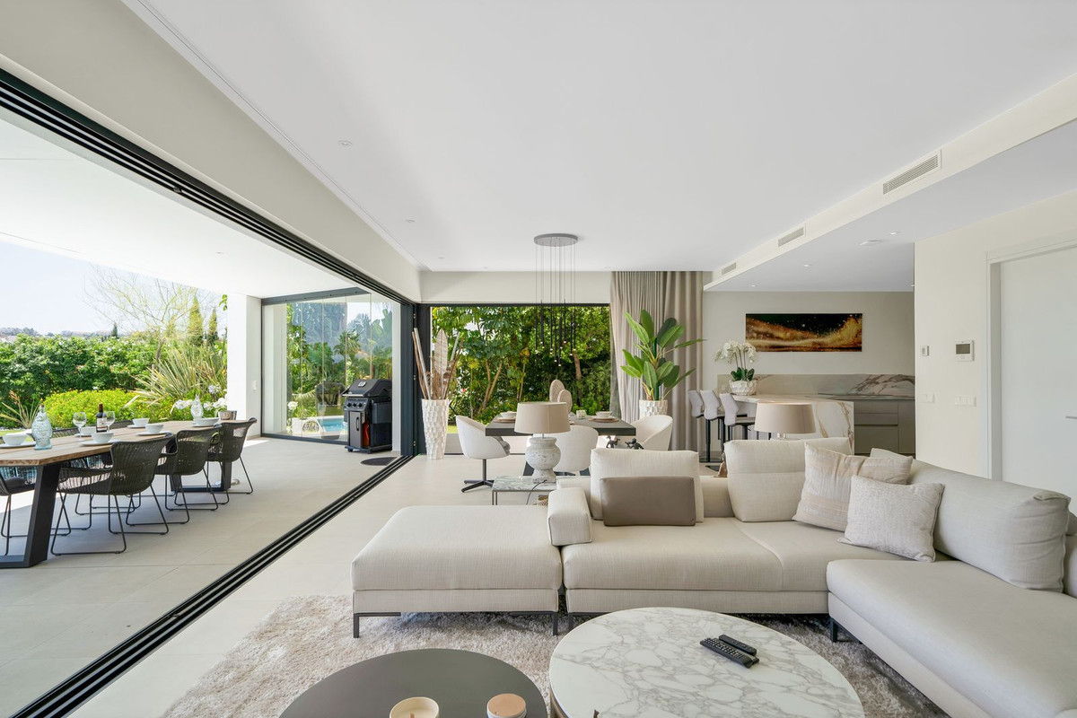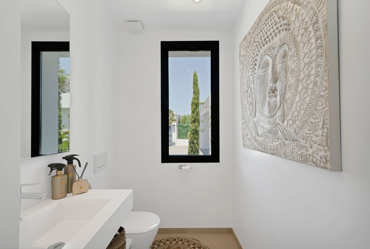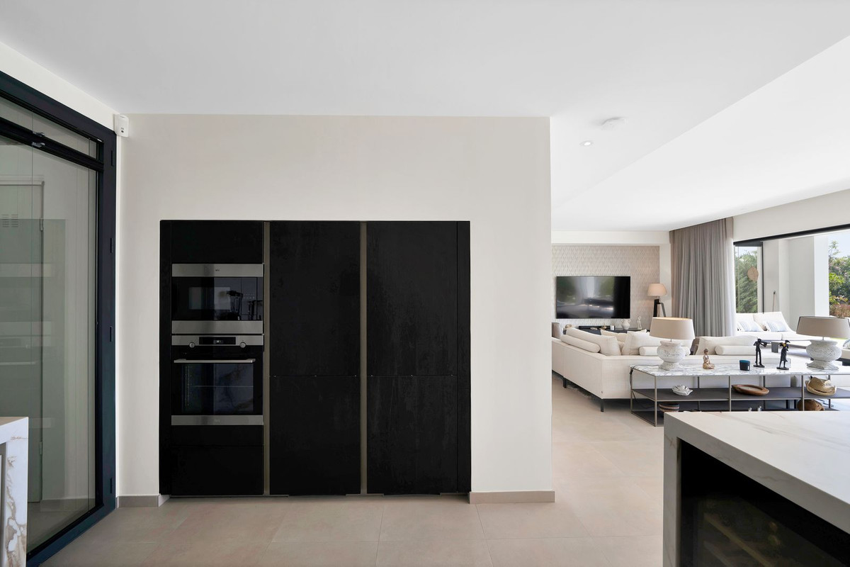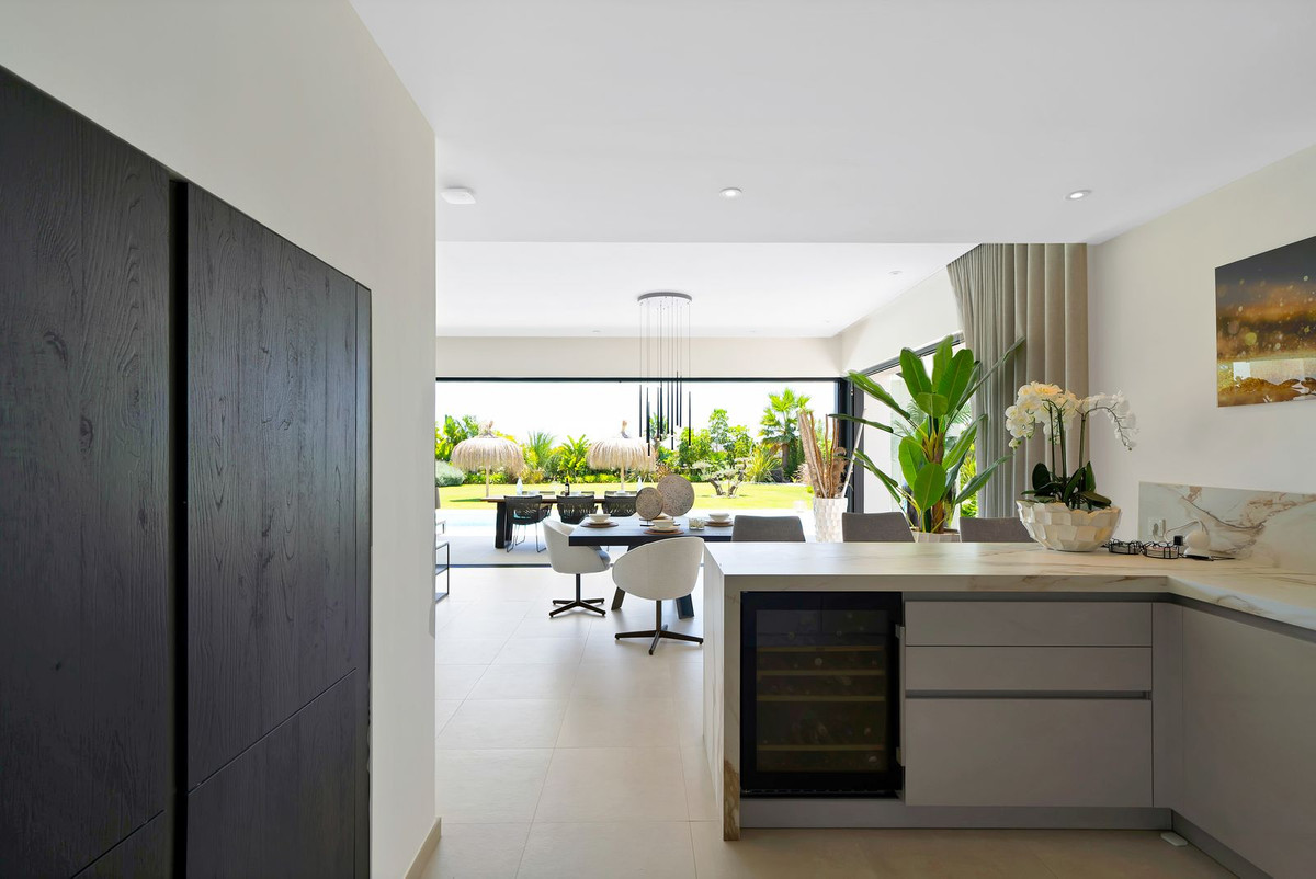 The ground floor boasts a stunning open plan living area, Through the impressive wooden front door which is both wide and tall, one enters the living room area, where the immediate impact of space and light create the feeling for this fabulous la Cala Golf villa. Floor to ceiling high quality patio doors flank all of the walls and are designed to slide delightfully into the walls, allowing that the interior open plan living space blends into the perfect alfresco experience by incorporation with the south-facing terrace. This terrace is further improved with the addition of glass curtains, meaning that come rain or shine, the outdoor space of this property is to be enjoyed, with the lovely views of the green and verdant gardens and the countryside beyond.