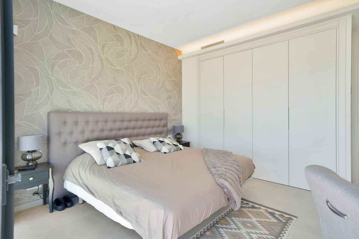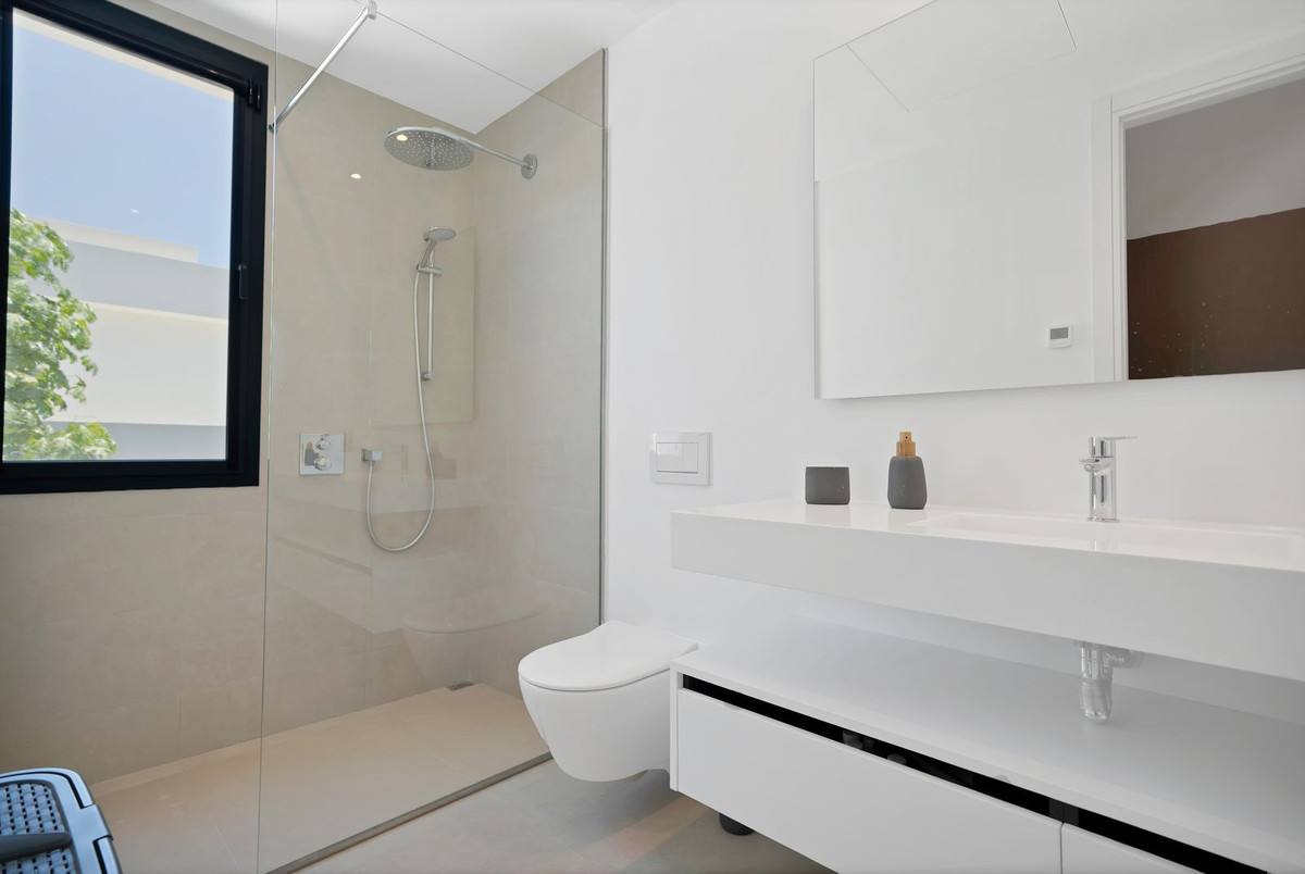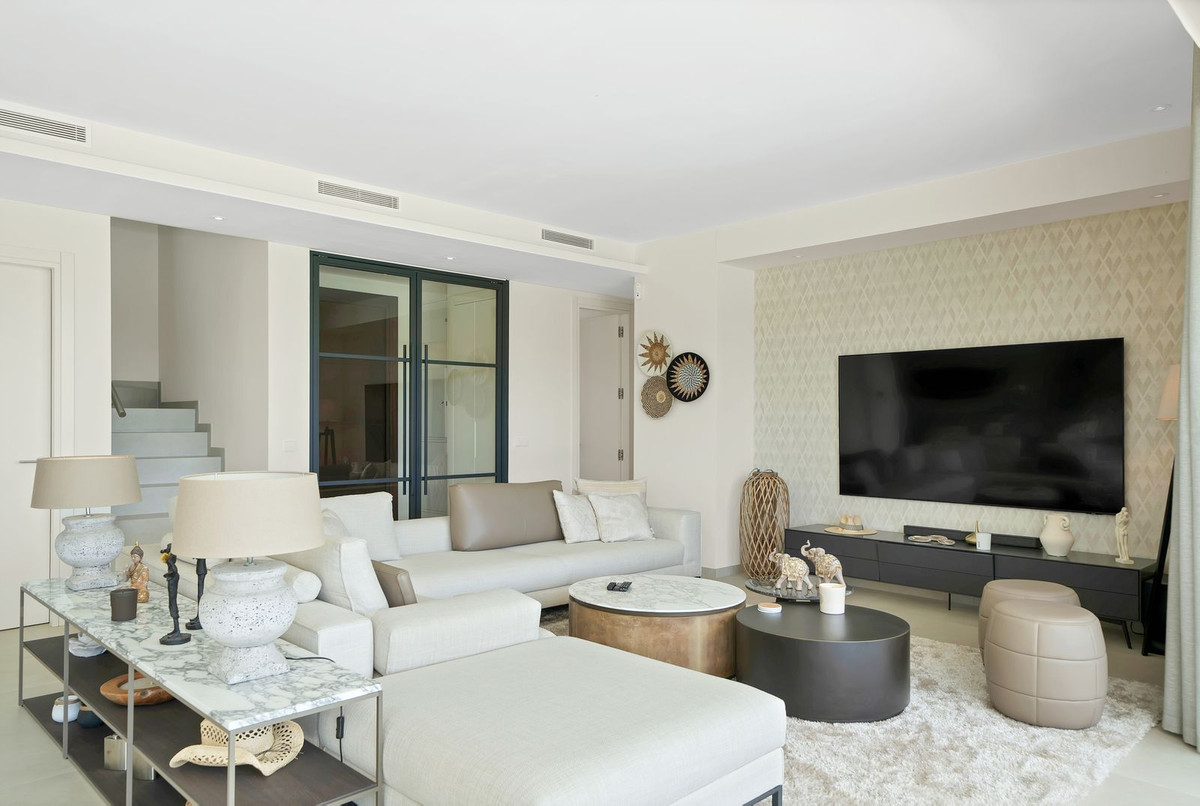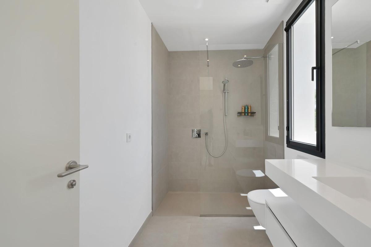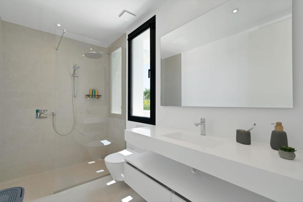 The ground floor boasts a stunning open plan living area, Through the impressive wooden front door which is both wide and tall, one enters the living room area, where the immediate impact of space and light create the feeling for this fabulous la Cala Golf villa. Floor to ceiling high quality patio doors flank all of the walls and are designed to slide delightfully into the walls, allowing that the interior open plan living space blends into the perfect alfresco experience by incorporation with the south-facing terrace. This terrace is further improved with the addition of glass curtains, meaning that come rain or shine, the outdoor space of this property is to be enjoyed, with the lovely views of the green and verdant gardens and the countryside beyond.