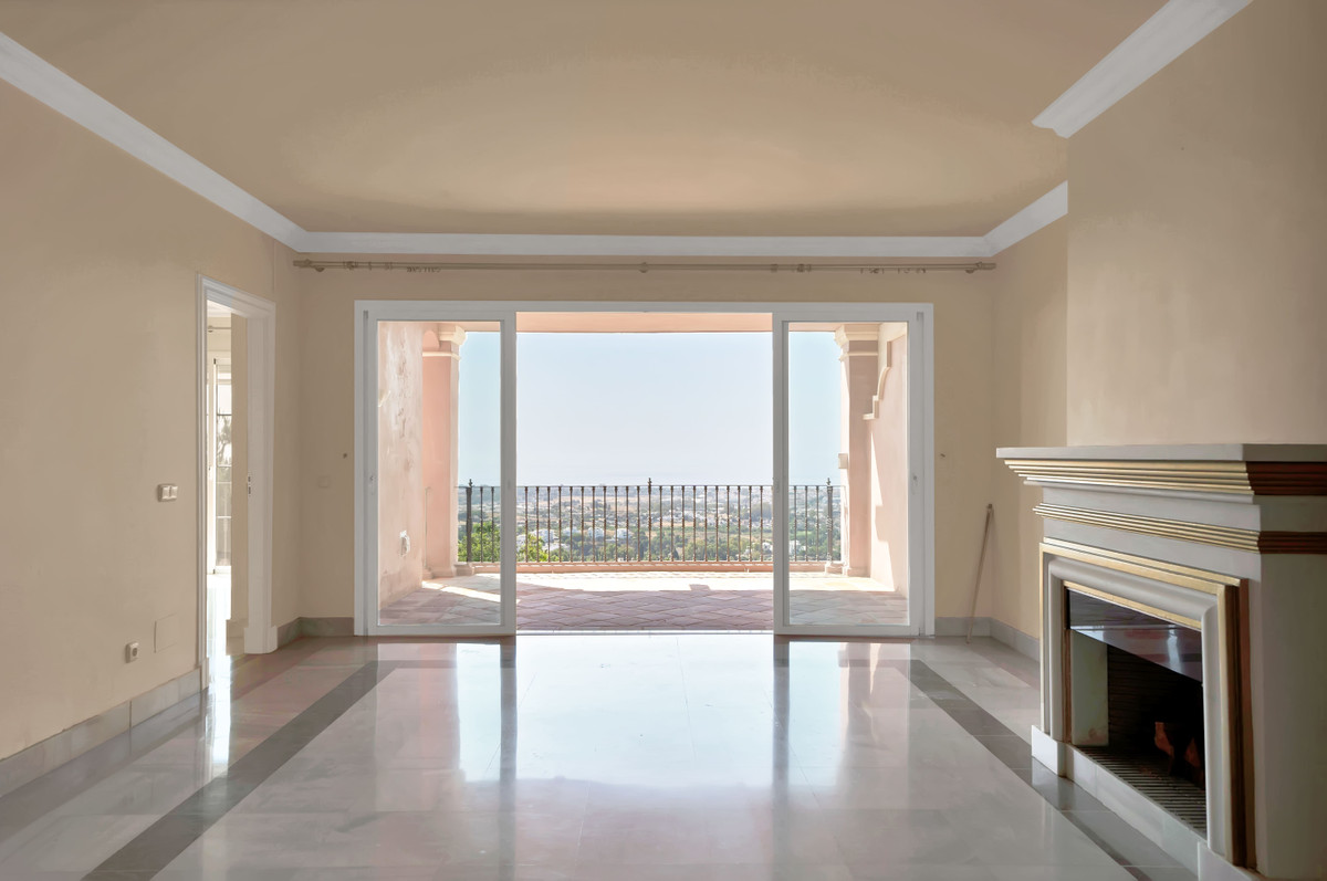 The living room opens directly onto a spacious south-facing terrace, offering endless panoramic views of the Mediterranean and the Marbella skyline a space where the blue of the sea becomes part of your daily life.