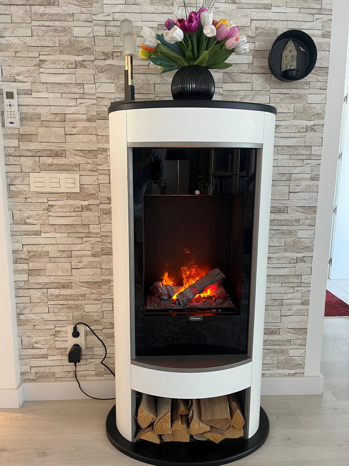 Spacious, comfortable and bright living area with a cozy electric fireplace and open views to mountains and green areas. In direct connection to this is an open concept fully fitted kitchen.