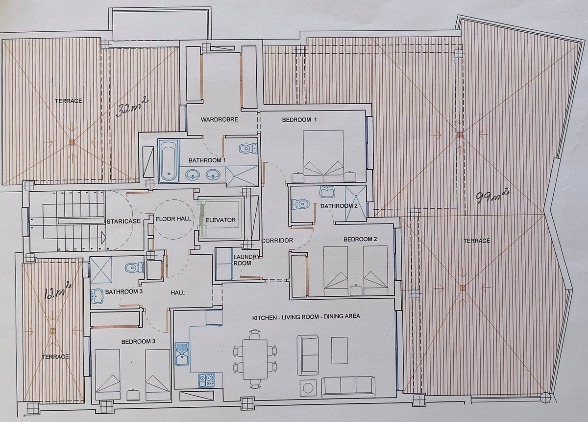 Become the owner of a 3 bedrooms apartment with three bathroom, two of which en suite and a huge roof terrace of 155 sqm in an modern development. Offering green spaces, a gym, sauna, saltwater swimming pool, private parking, and storage room.