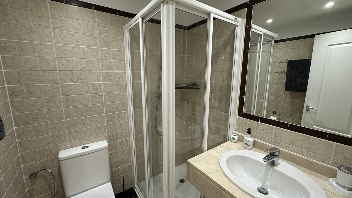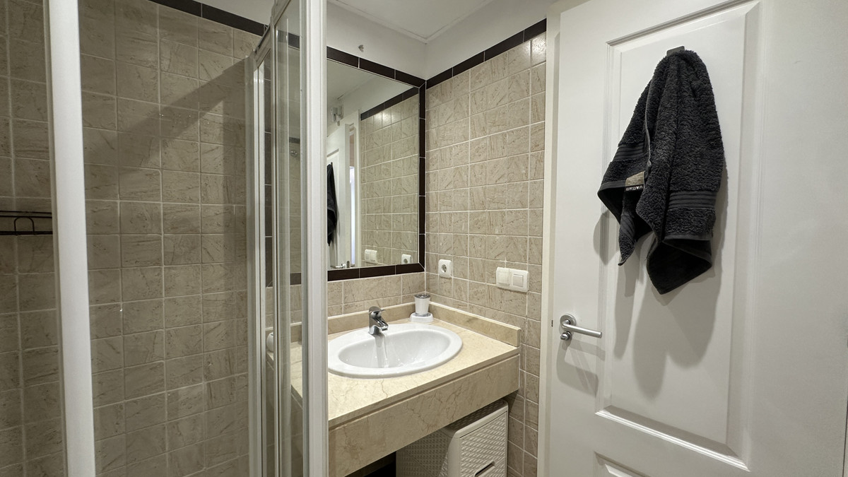 To the right of the entrance, you’ll find the master bedroom with en-suite bathroom, the family bathroom with a walk-in shower, and the second bedroom. The master bedroom has a south-facing window overlooking the communal gardens and pool, and the en-suite includes a modern, spacious walk-in shower.