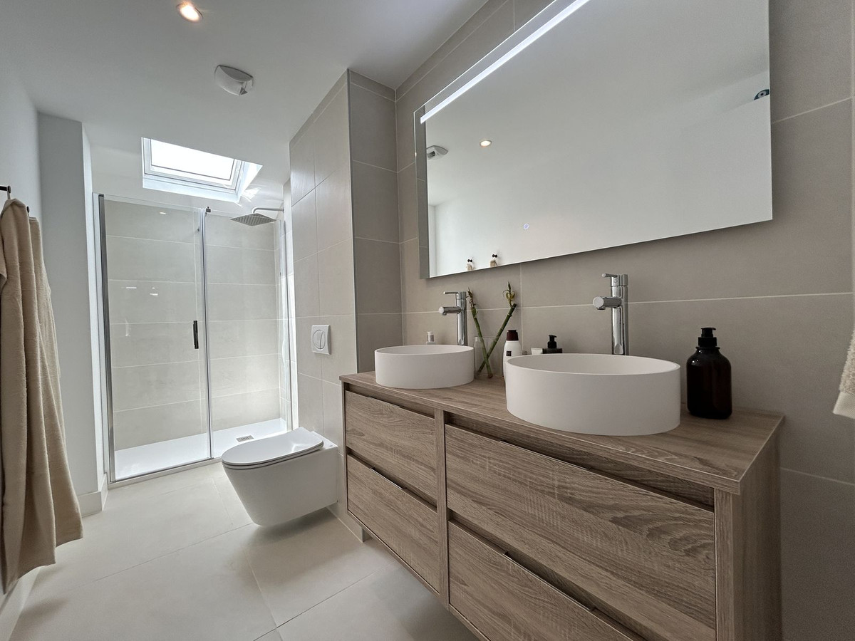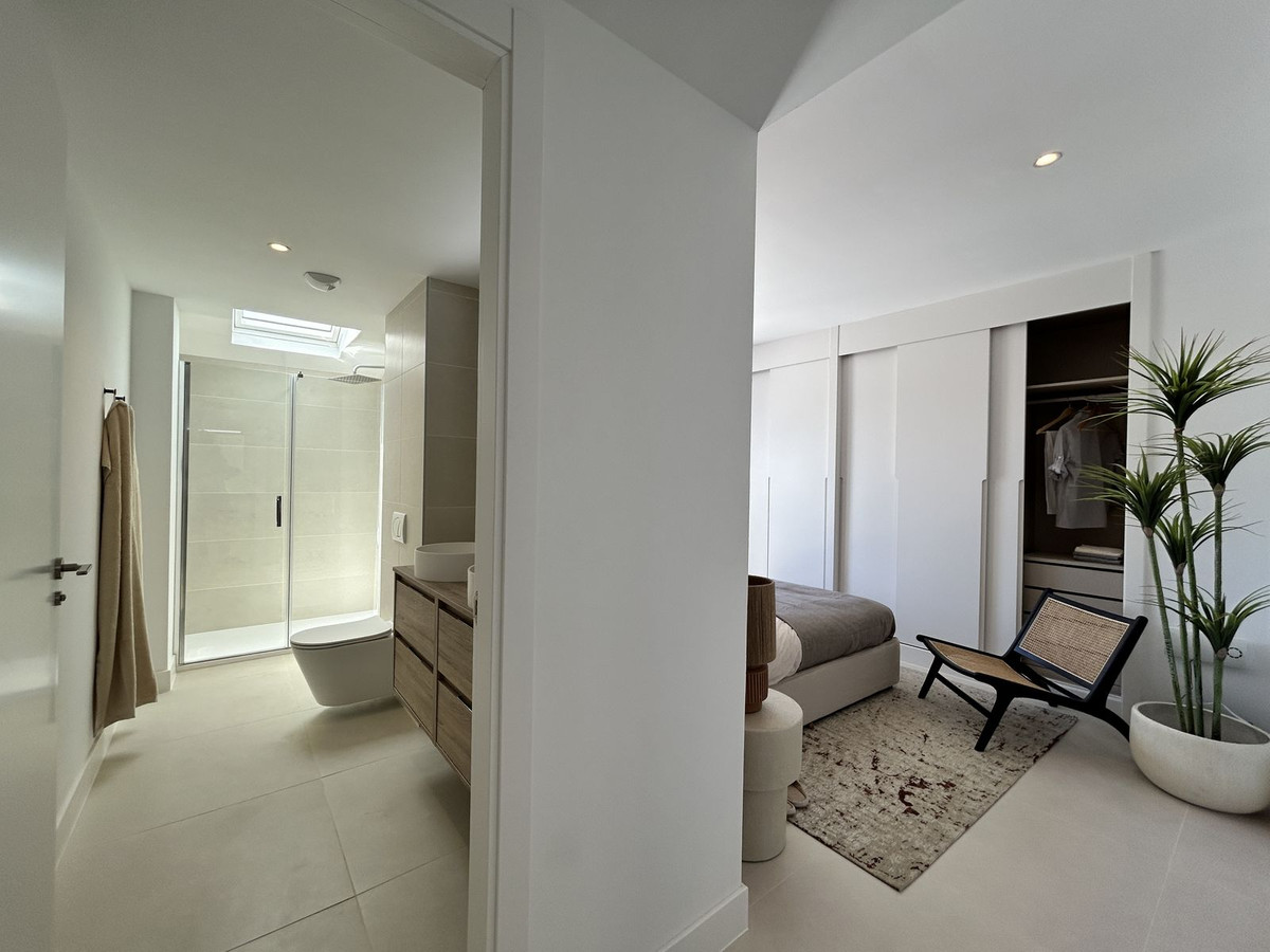 The living room and kitchen are integrated and open onto the large terrace through high-performance sliding doors, maximizing the natural light and outdoor living. Comfort and efficiency: air-source heat/air conditioning in all rooms, underfloor heating in bathrooms, aluminum/PVC exterior carpentry with double thermoacoustic and security glazing, and pre-installed motorized blinds in the bedrooms and living room.