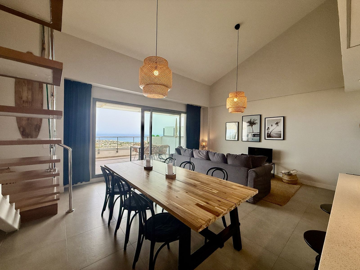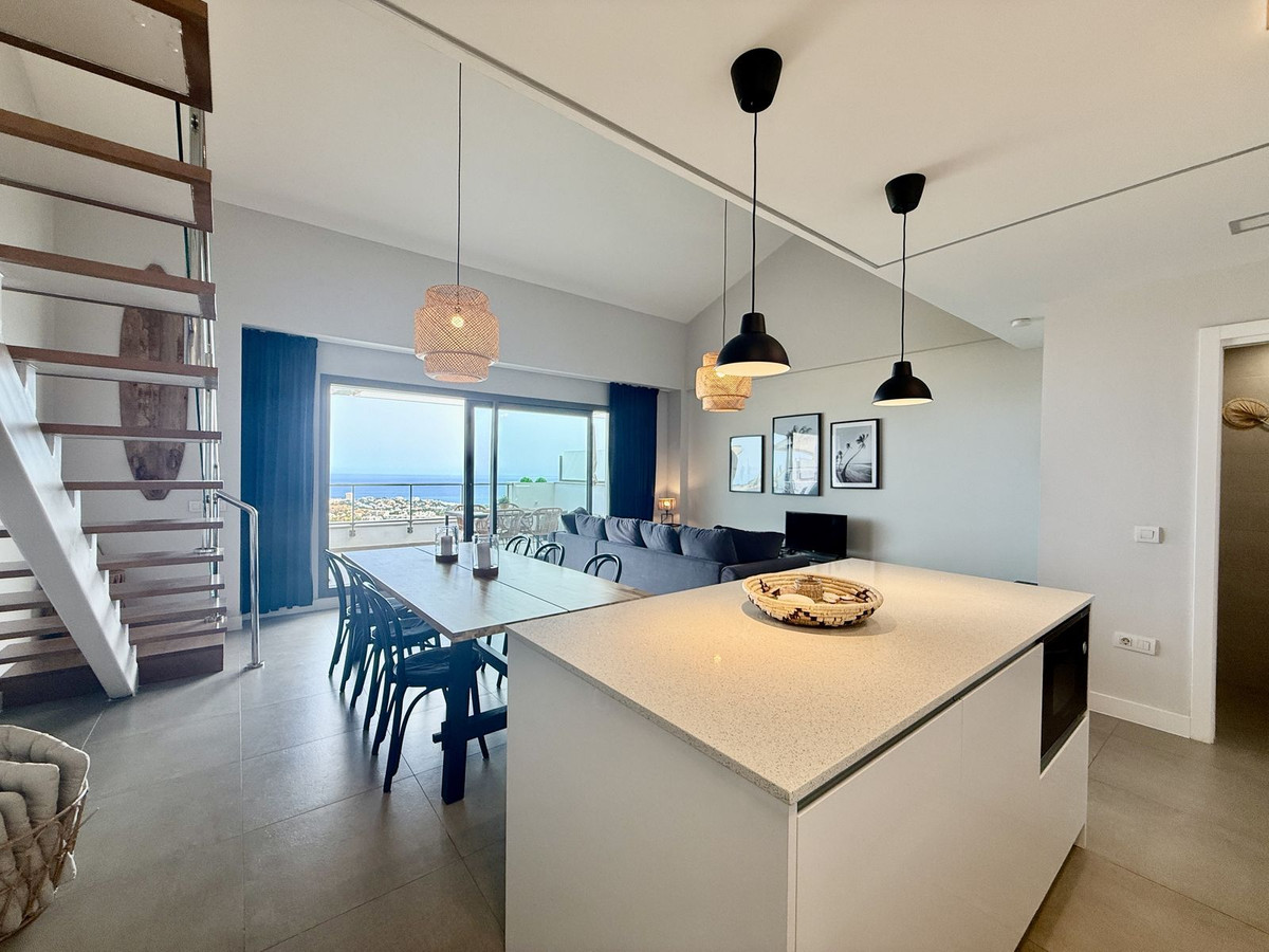 On the ground floor, there is a living/dining room with access to a ground floor terrace with panoramic sea views, a kitchen island equipped with state-of-the-art appliances, and a guest toilet.