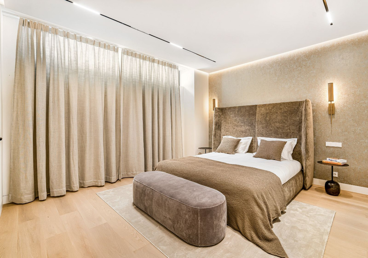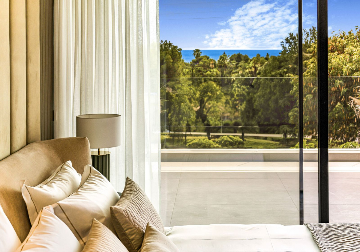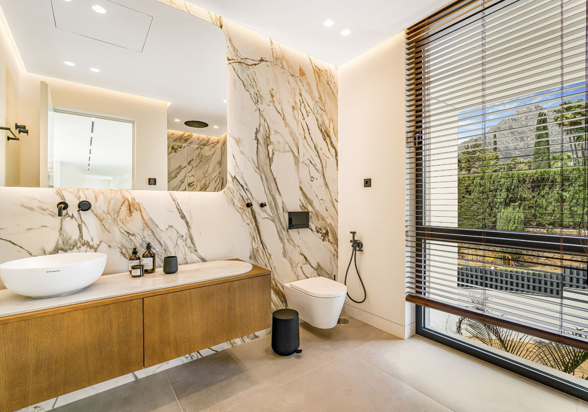 Strategically positioned on an elevated site facing south, the villa boasts spectacular views of the Mediterranean Sea and the iconic La Concha mountain, filling the interiors with natural light throughout the day.