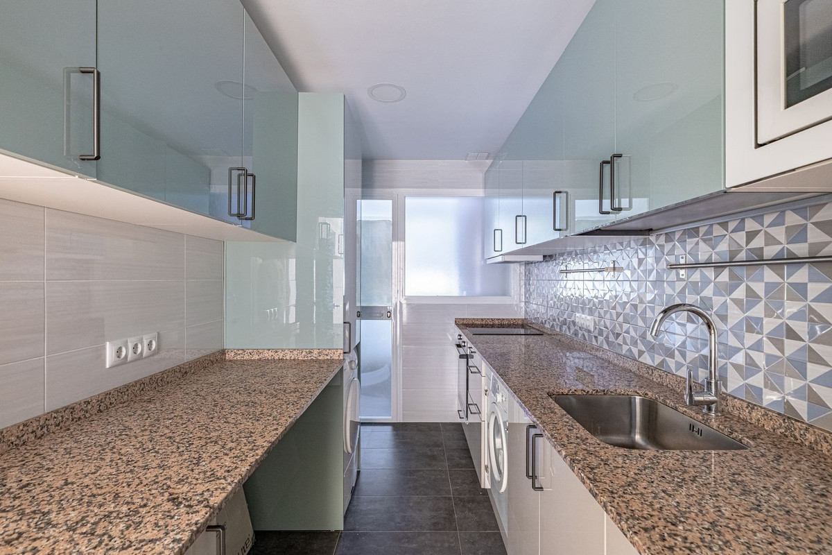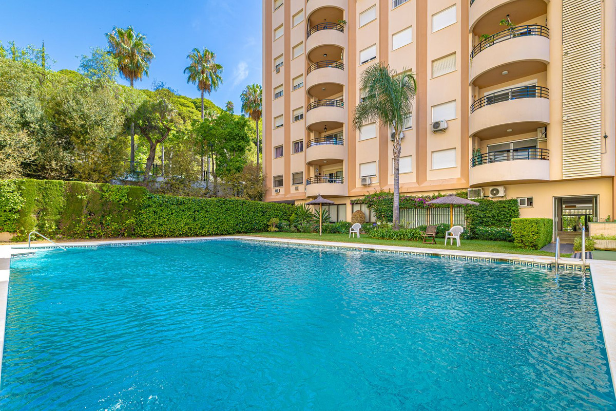 Impeccable top floor apartment in the heart of Marbella, just a 5-minute walk from the beach and the promenade, and next to supermarkets and shops. The property was renovated very recently, and features: a living/dining room with access to the terrace offering beautiful sea views, a master bedroom with en-suite bathroom, two further bedrooms each with their own bathroom, a fully equipped kitchen, and a laundry room. The complex has a swimming pool and garden, and a secure communal car park.