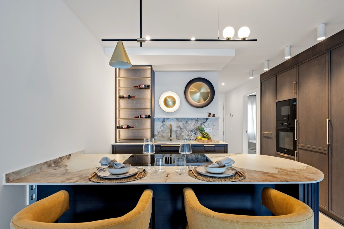 A fully customized designer kitchen with rounded-edge carpentry, indirect LED lighting, and a built-in open wine display — merging natural textures with contemporary function