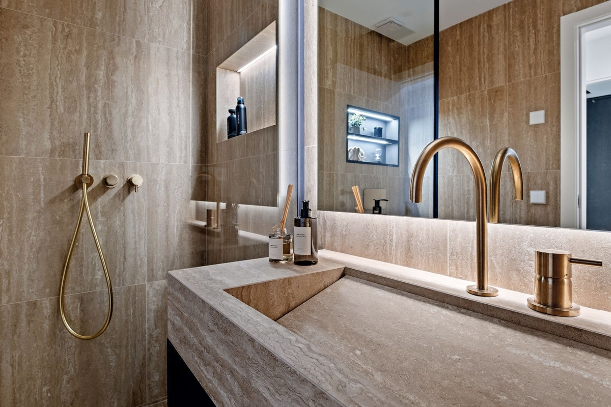 Two spacious bedrooms and two luxuriously appointed bathrooms, both featuring rain showers, floating vanities, and suspended toilets