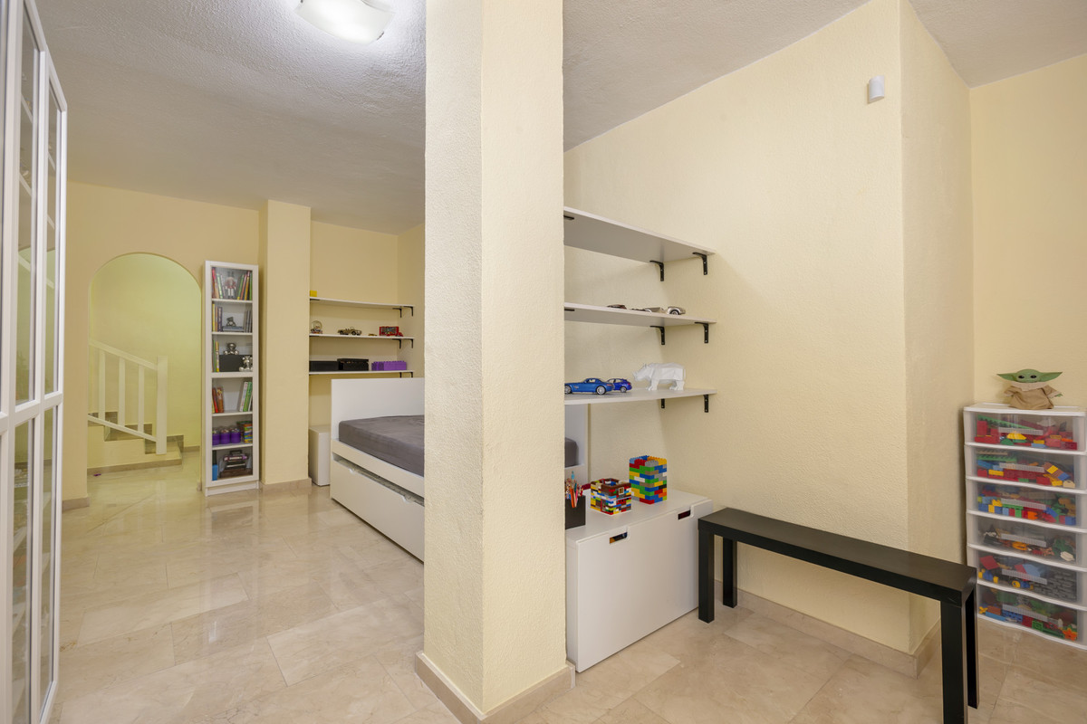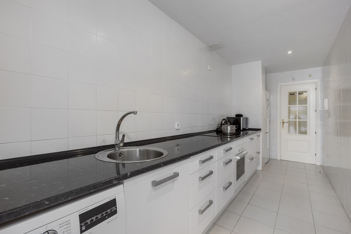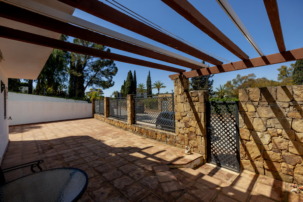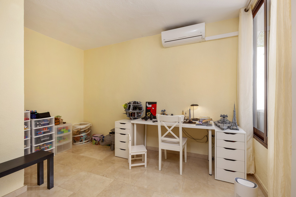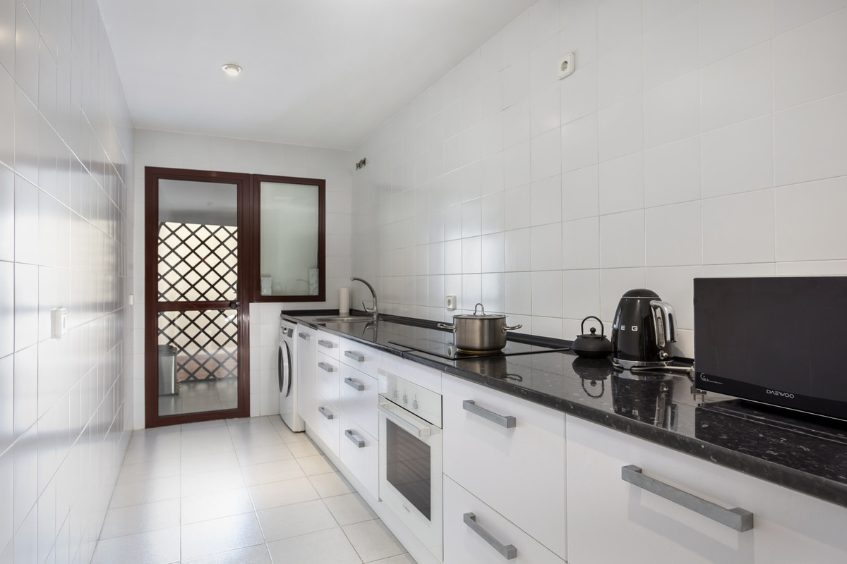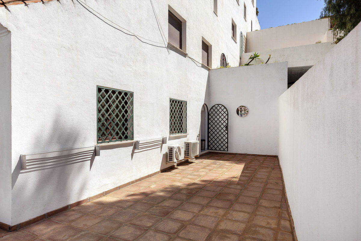 Lovely ground floor, West facing, three-bedroom apartment in the gated and well-established community Coto Real on Marbella's Golden Mile. The community boasts well-kept communal gardens and swimming pools and just a short drive to Marbella, Puerto Banus and all leisure amenities. This well-located property has; an open plan living and dining area; fully equipped kitchen with separate utility area and access to the large corner terrace which could be converted into a beautiful garden; three bedrooms; and two bathrooms. Other features include hot and cold air conditioning, marble floors, fitted wardrobes, storeroom, two private parking spaces and concierge service.