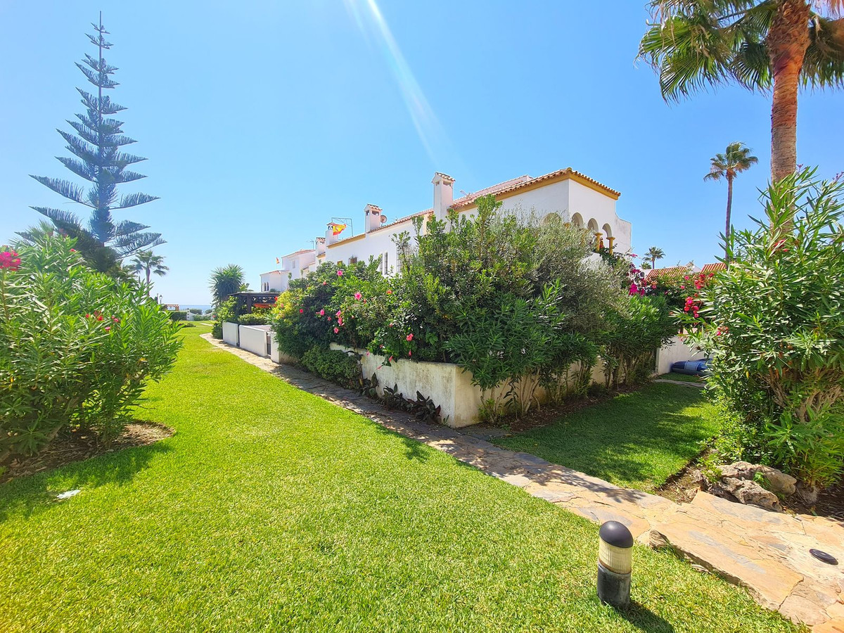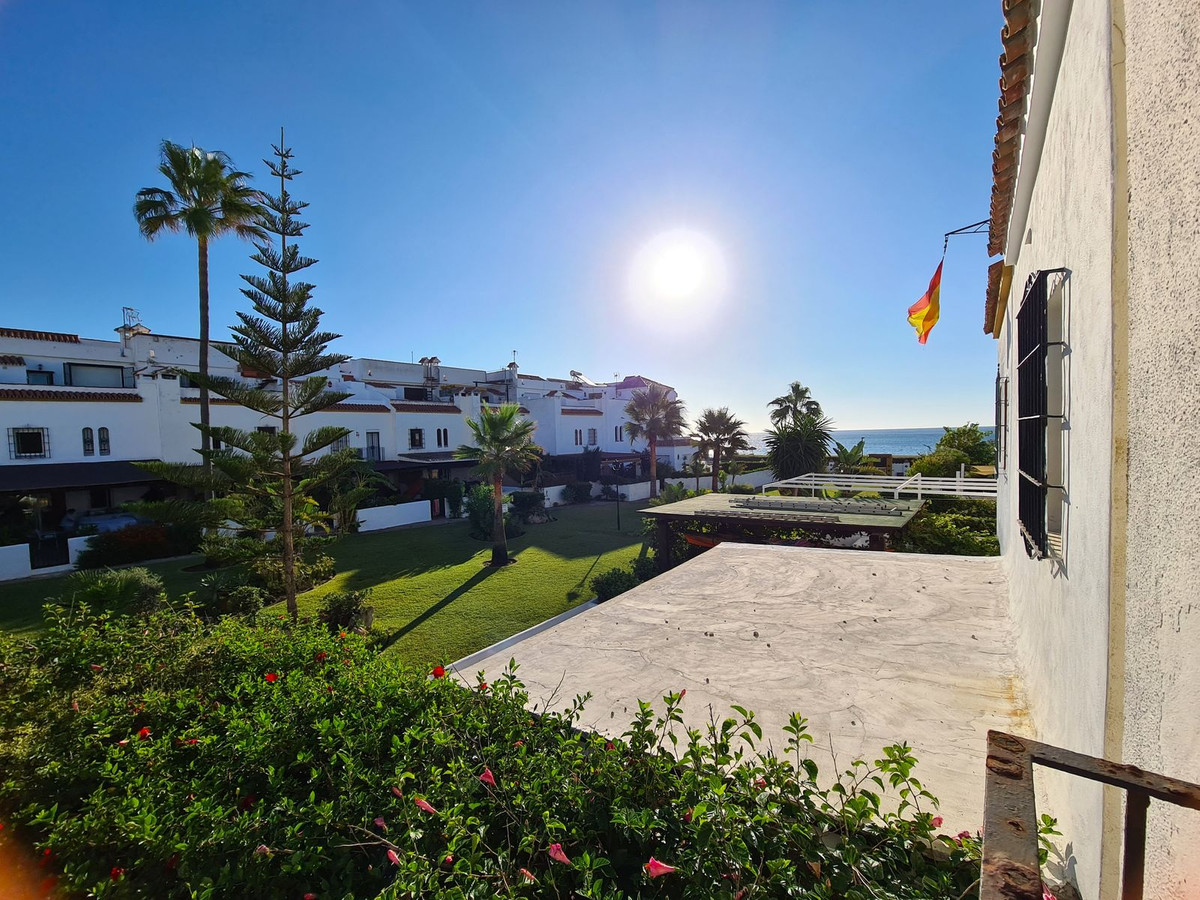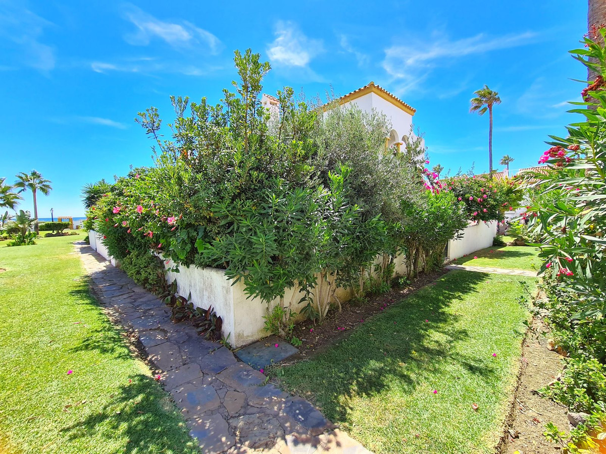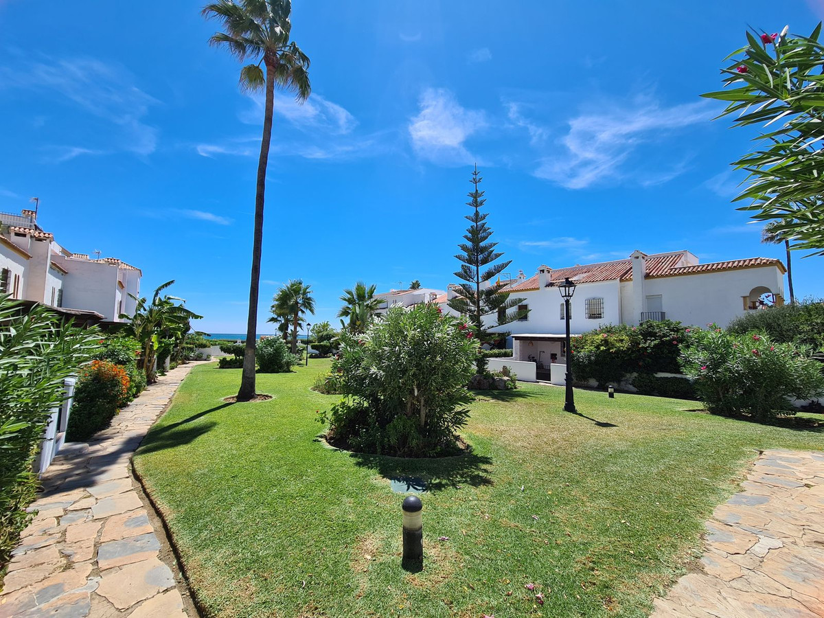 Excellently located in a beachfront development with access to the Coastal Path that connects the entire Costa del Sol, and the beach is just steps away. Close to supermarkets, shops, restaurants, and a wide variety of leisure options, Sabinillas is just a 2-minute drive away and Estepona is 10 minutes away, while Malaga Airport is a 90-minute drive away. The property is spread over two floors plus the solarium. On the ground floor, we find the main entrance with a spacious hall, a toilet with a window, a large kitchen with access to the rear terrace, and a large living-dining room with a fireplace and access to a porch that connects to the large private garden. The first floor houses the house's three bedrooms, each with its own private terrace and built-in wardrobes. It also has a spacious full bathroom equipped with a bathtub and a large window. The master bedroom has an en-suite bathroom equipped with a bathtub and a large window, as well as a beautiful private covered terrace. On the upper floor, we have a turret, a storage room, and a large solarium with views of the sea, gardens, and the pool. This well-maintained complex offers swimming pools, gardens, and beach access. A GREAT OPPORTUNITY TO EXPERIENCE THE LUXURY OF HAVING YOUR OWN HOME JUST STEPS FROM THE SEA!