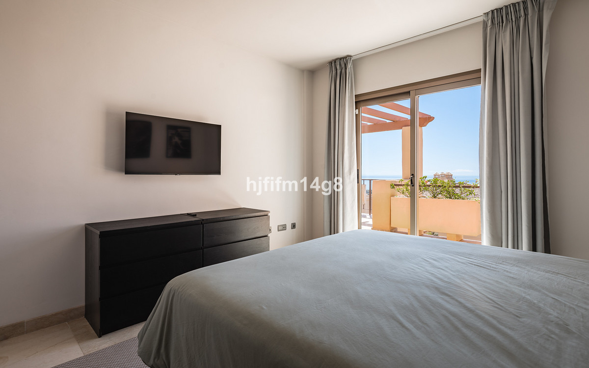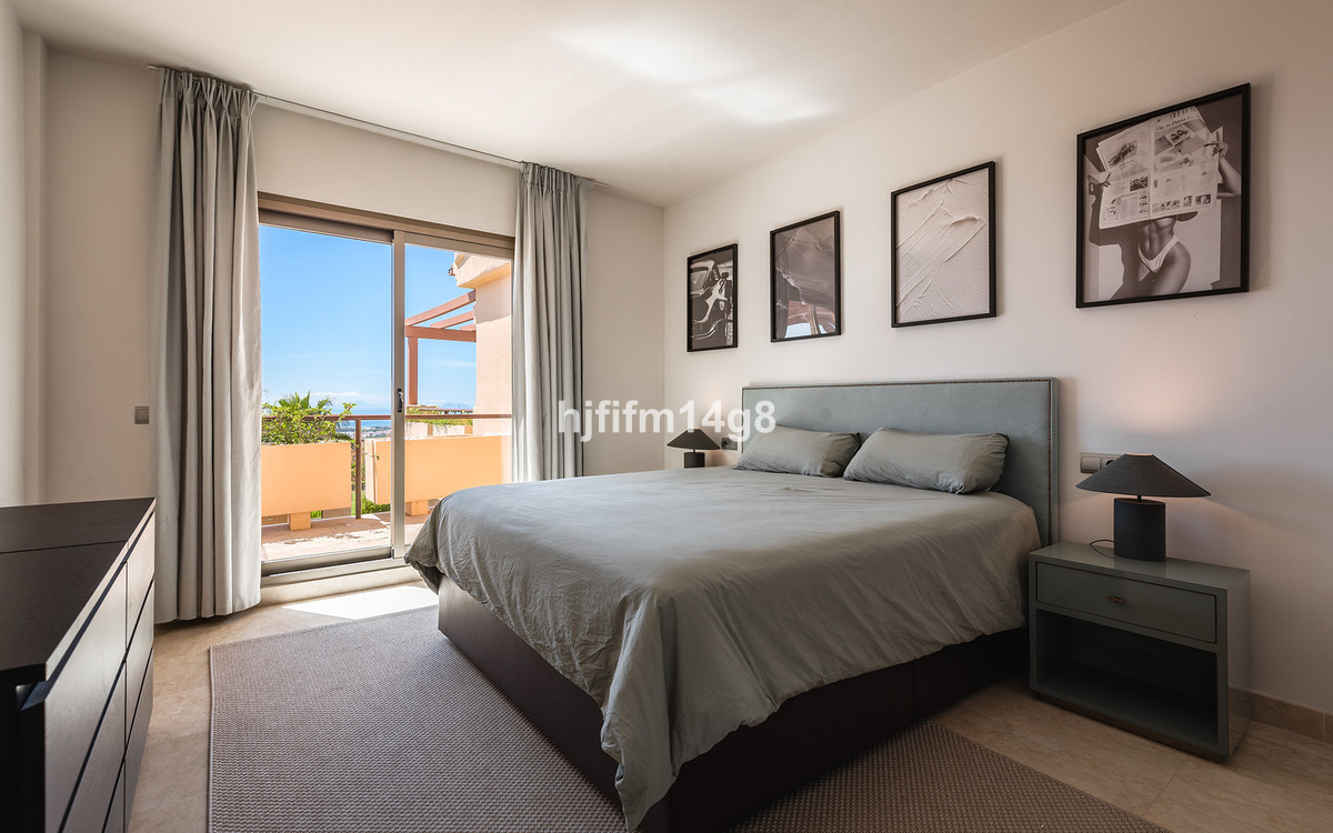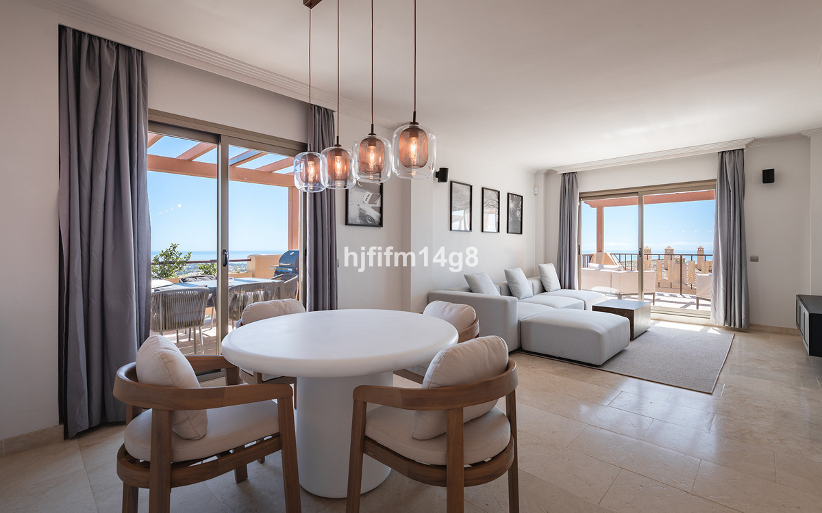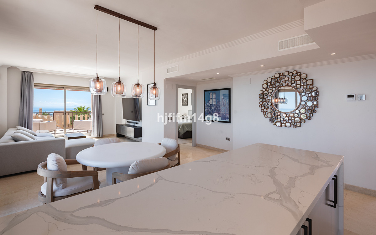 This luxurious single-level penthouse offers stunning panoramic views of the sea and mountains. The property features an entrance hall leading to a spacious living and dining area, which opens onto two terraces: one facing southeast with views of La Concha mountain, the Atalaya Golf Course, and the Mediterranean Sea; the other facing south/southwest, showcasing sweeping vistas of the sea, Gibraltar, and the North African coastline.