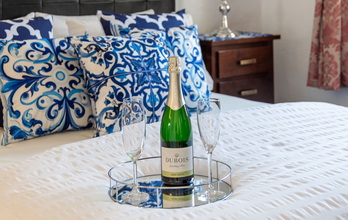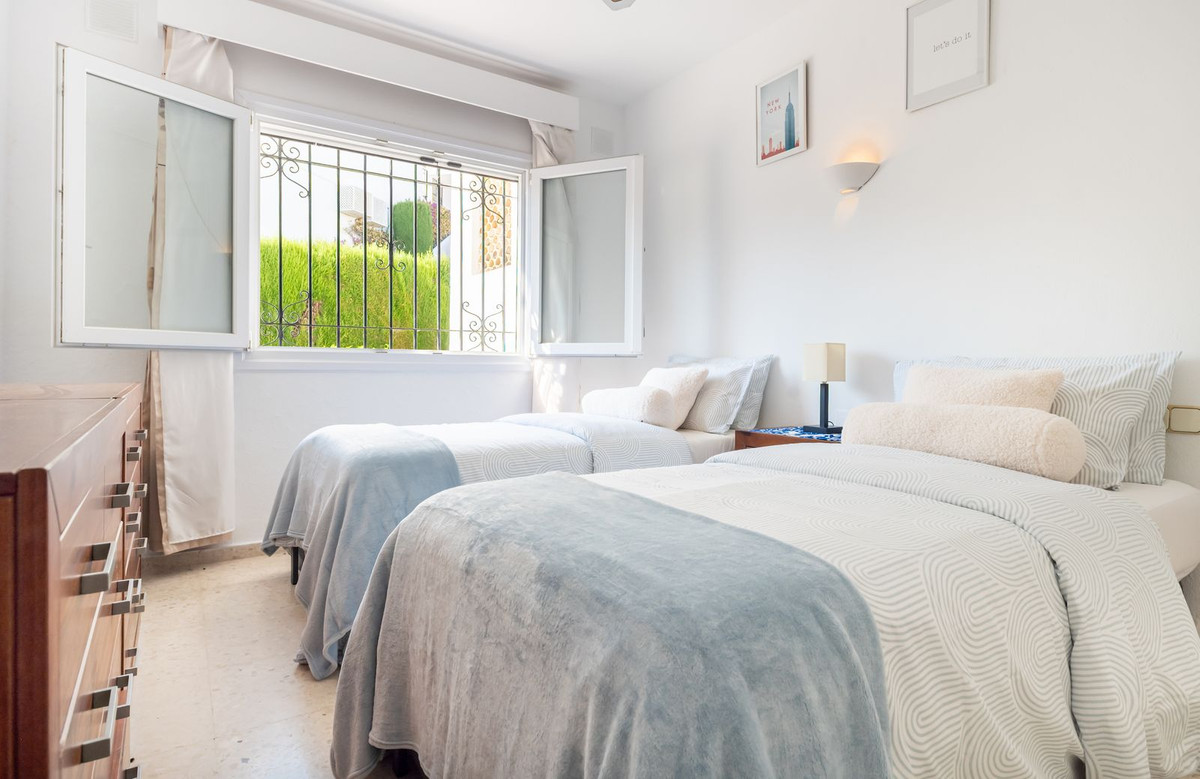 The adjoining double guest bedroom is equipped with 2 single beds, double panelled wardrobes and Mahogany wood furniture, views are to Bougainvillea filled palm gardens.