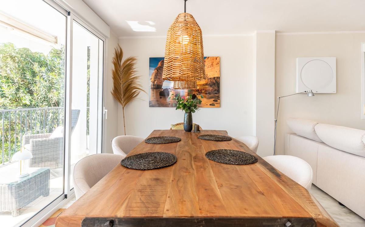 The apartment features a welcoming entrance hall, a spacious and bright living room with a guest toilet, storage room, and a stylish kitchen. From the living room, you have direct access to a fantastically spacious terrace, divided into several inviting zones: a lounge area, outdoor kitchen, open-air shower – and space to install a jacuzzi. The entire terrace offers **spectacular panoramic sea views**, perfectly completing the experience of authentic southern Spanish living.