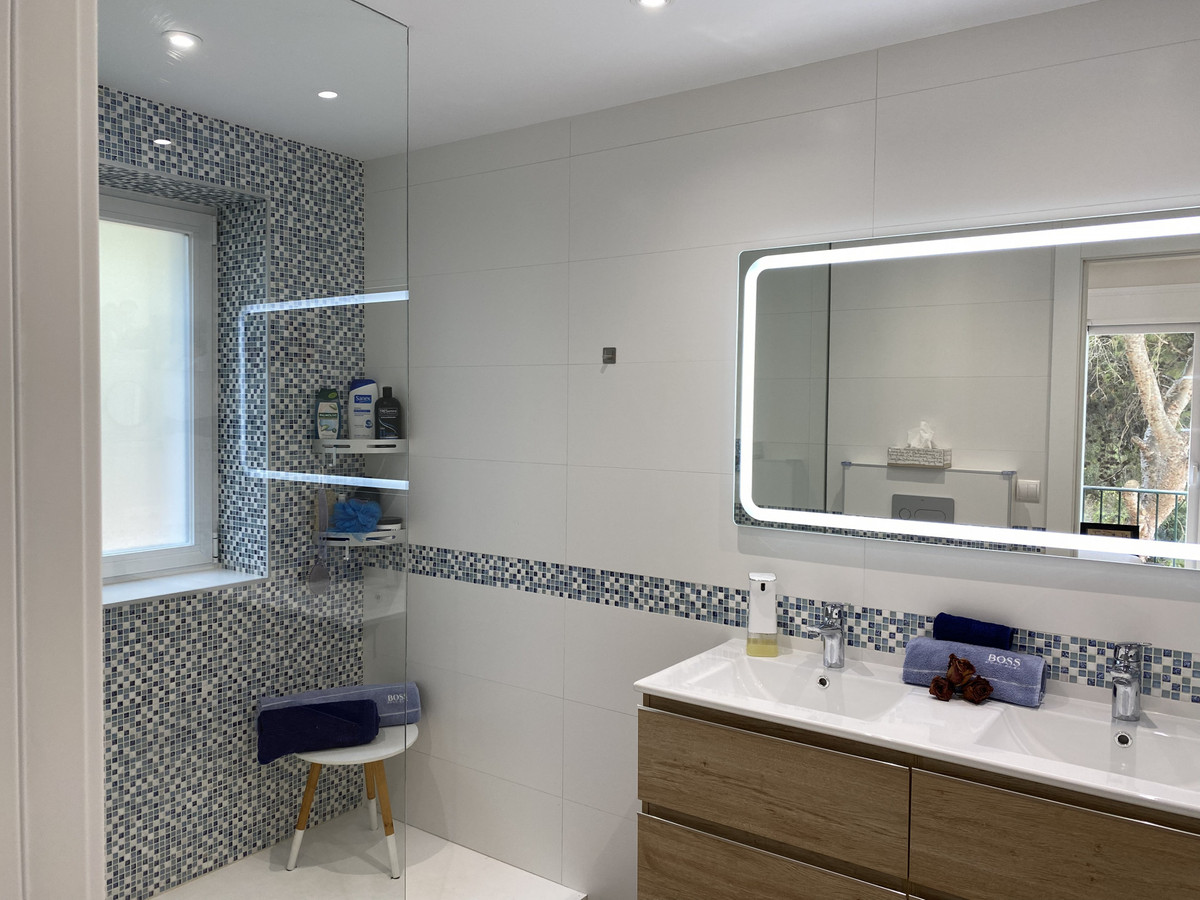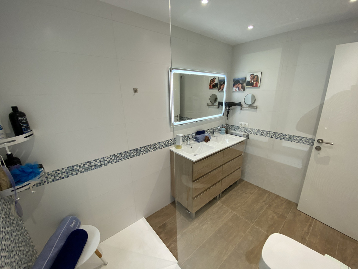 The apartment features three spacious bedrooms and two modern bathrooms, making it ideal for families or those seeking a refined retreat. The open-plan kitchen is fully fitted and equipped with premium appliances, seamlessly blending into the elegant living space. The property comes fully furnished, with fitted wardrobes and tasteful decor that complements its contemporary design. Additional conveniences include a laundry room, storage room, and a ceiling cooling system powered by advanced aerothermics technology.