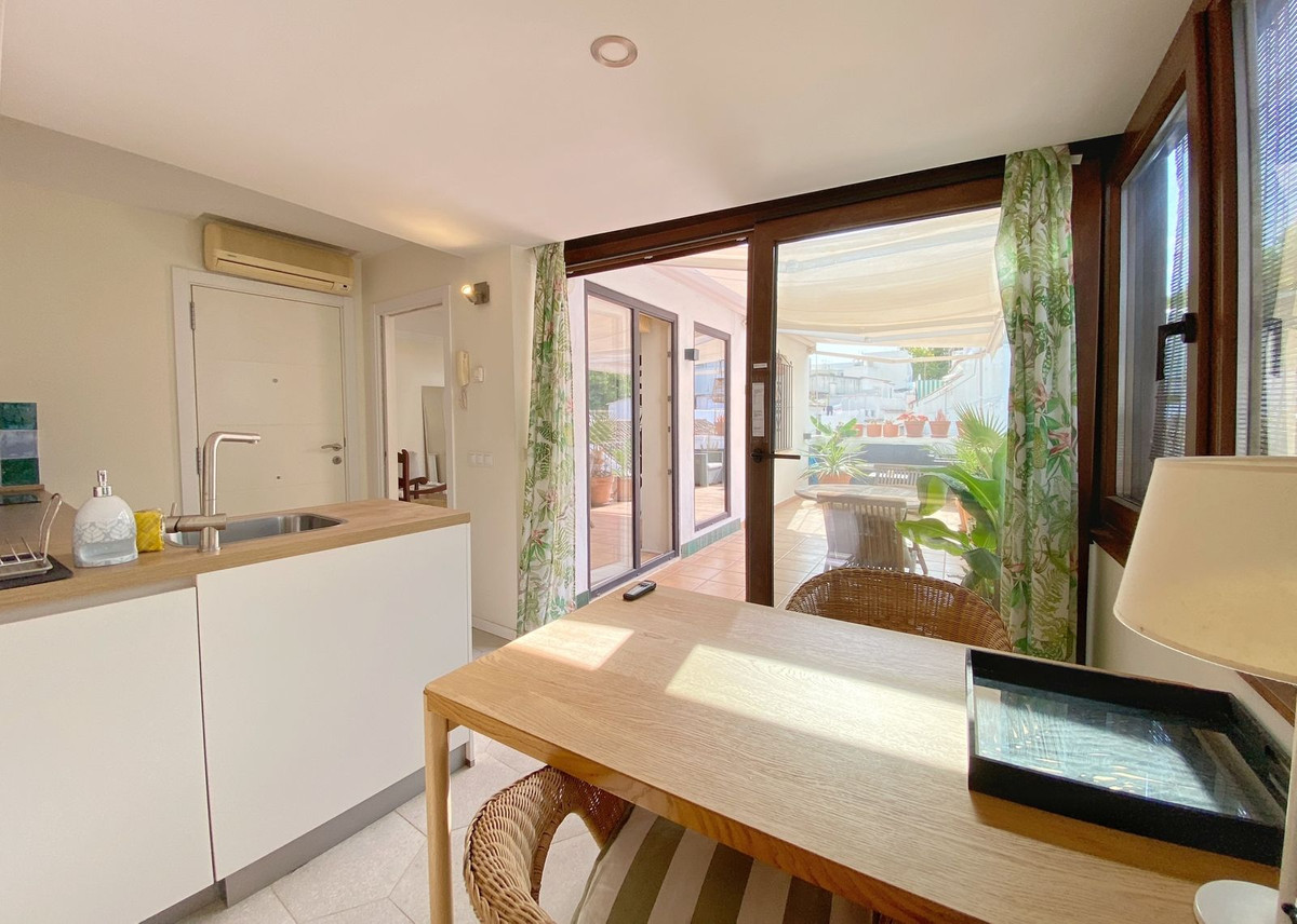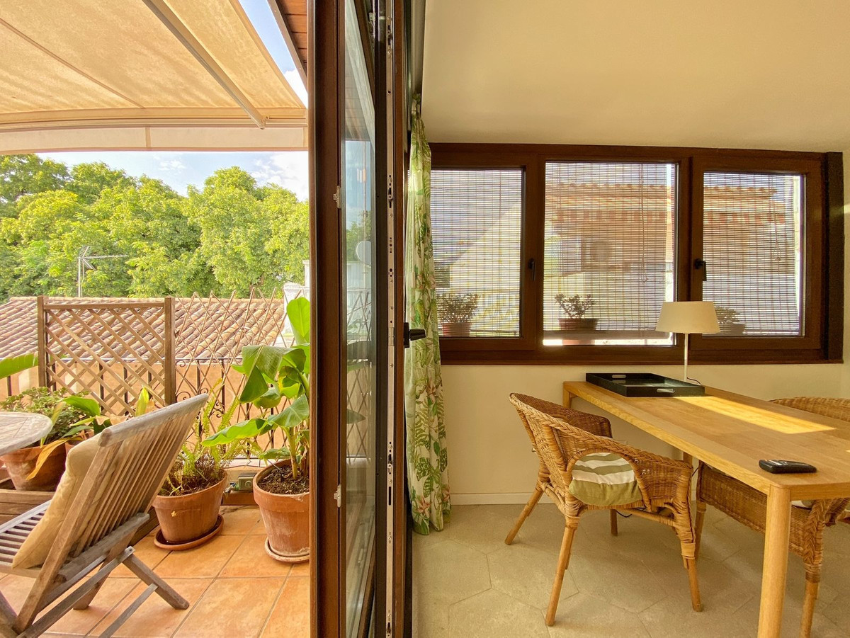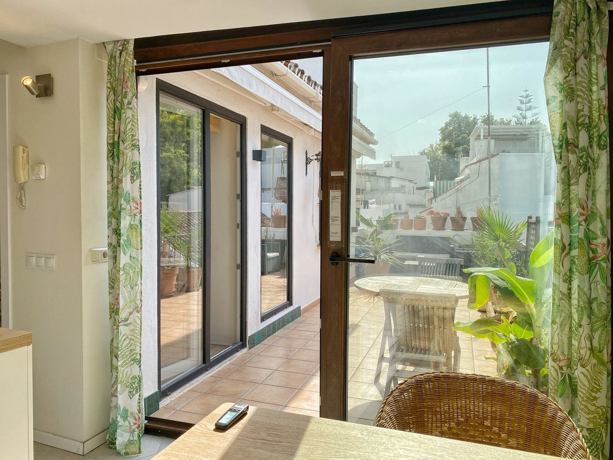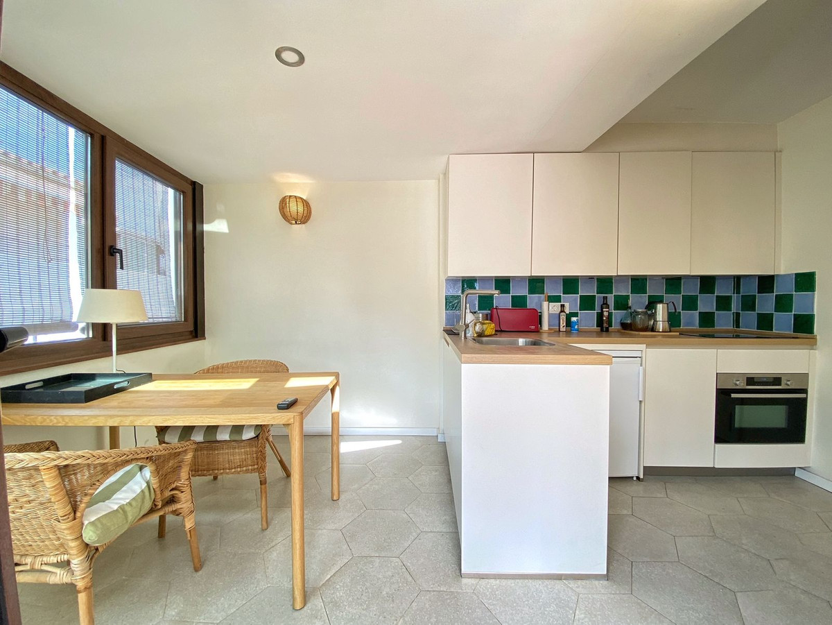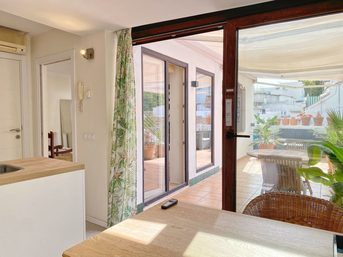 Located on a quiet pedestrian street in Marbella's Old Town, very peaceful and quiet. The apartment has a separate bedroom, a bathroom with a shower and an exterior window, a cozy living room, and a fully equipped kitchen with a dining area, both with direct access to a fantastic outdoor terrace of aprox. 25 sqm, where there are different areas to relax or sunbathe on the sun lounger, or to sit and eat outside.