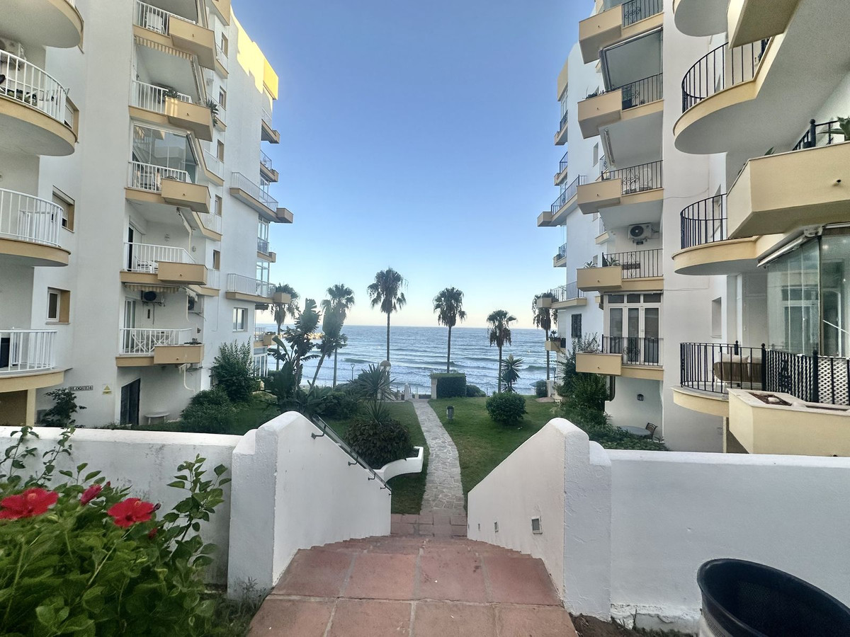 Fantastic opportunity in the sought-after Marbella del Mar complex, set directly on the beachfront and only 10 minutes’ walk to Marbella Old Town. This 1-bedroom, 1-bathroom ground floor apartment offers a spacious terrace with pool views and lateral sea views, ideal to reform and create your dream coastal residence or a profitable holiday rental.