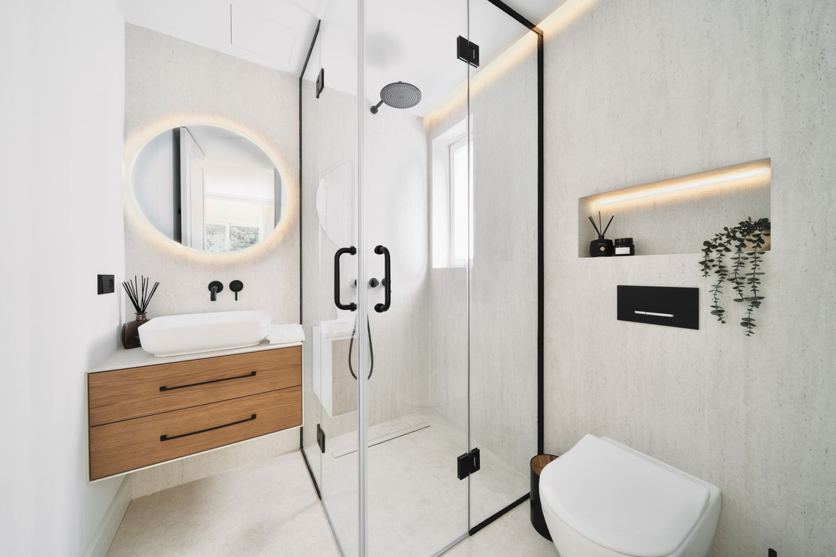 There are two guest bedrooms, each with their own en-suite bathroom, as well as a guest WC hidden behind a panelled wall.