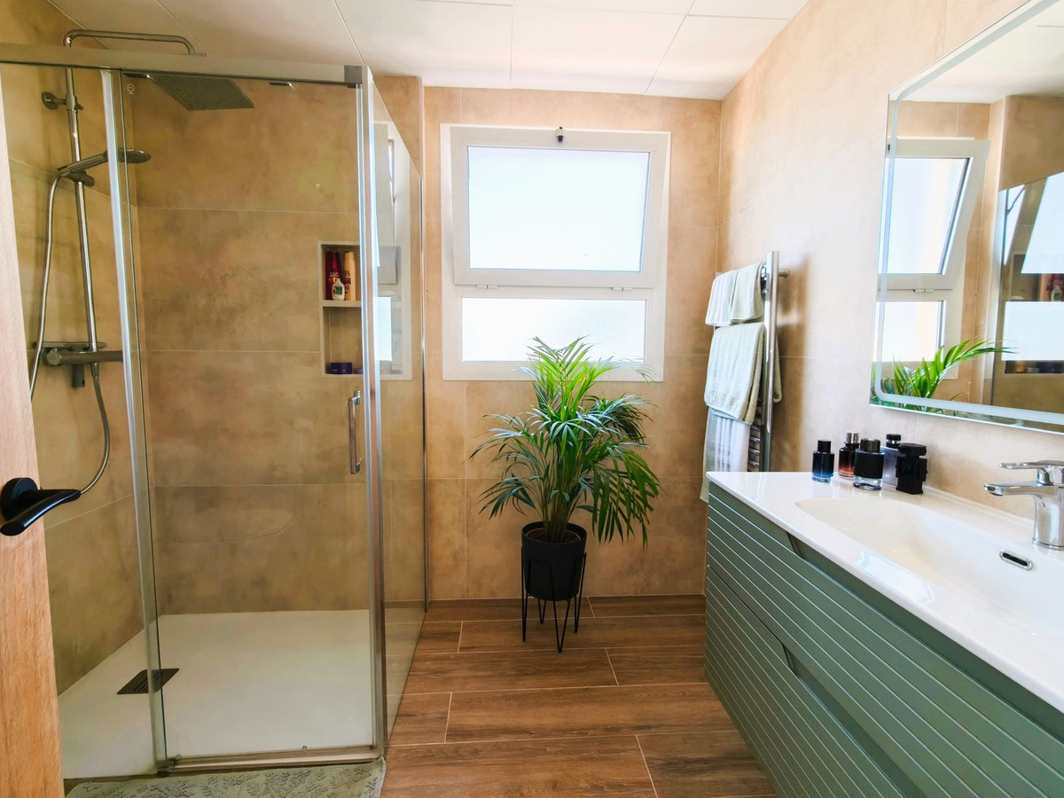 The property features three spacious en-suite bedrooms, all with direct terrace access, including a stunning master suite with a walk-in closet. On the entrance level, one of the bedrooms opens onto the large main terrace, while the other two are upstairs, each with its own private terrace. In addition, there is a convenient guest toilet.