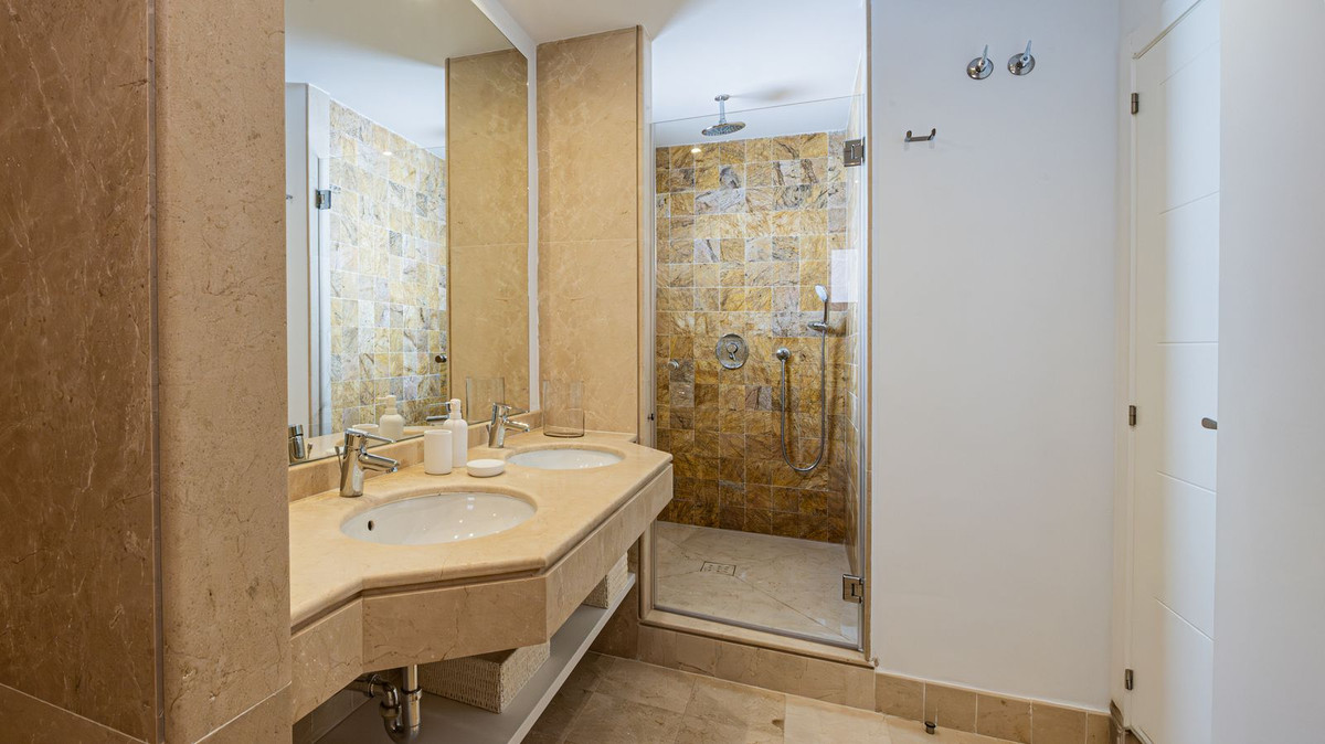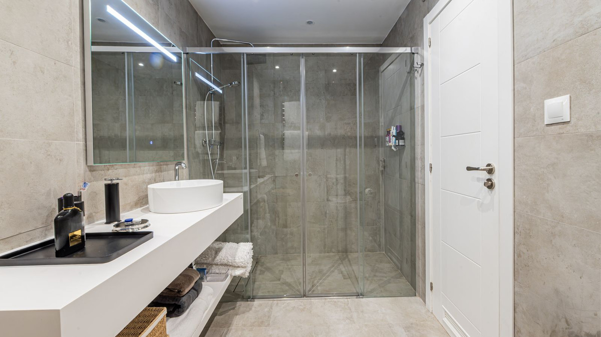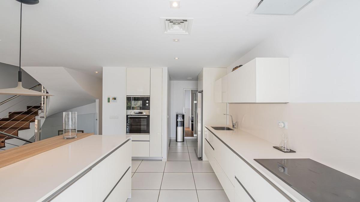 The villa is distributed over 3 levels, all connected by a private elevator. It has 4 bedrooms, all with en-suite bathrooms, plus a guest toilet. The master bedroom features a fantastic walk-in wardrobe, large terraces, a fully equipped kitchen, and a laundry room.