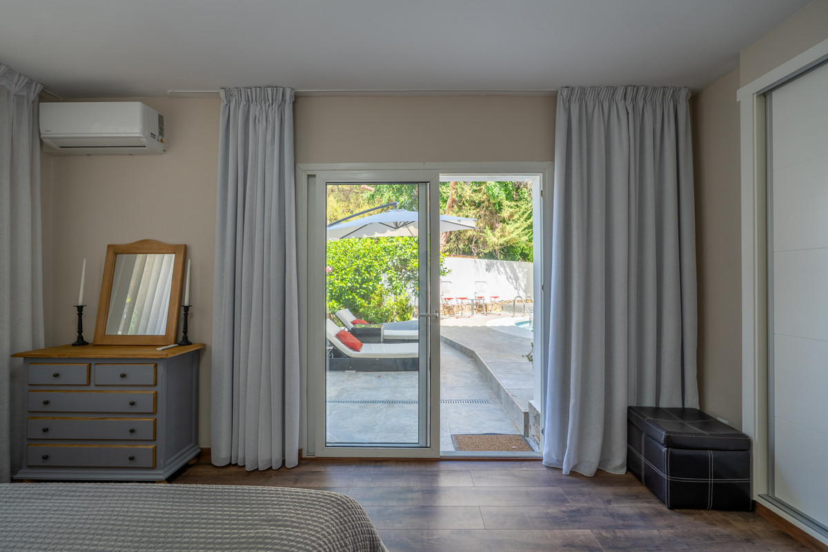 The villa is set on a private plot of approximately 637 square meters, with a total built area of 295 square meters distributed over two levels. With a south-facing orientation, the home enjoys abundant natural light throughout the day and offers open views to the sea, mountains, garden, and pool.