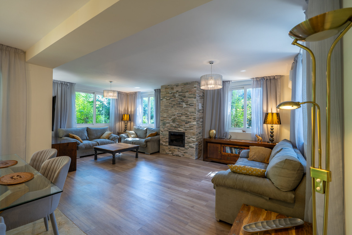 Inside, the property features four spacious bedrooms and three modern bathrooms. The main living area is bright and open-plan, seamlessly connecting the lounge, dining area, and a fully equipped contemporary kitchen. High-quality finishes include porcelain and stone flooring, fitted wardrobes, and a combination of central heating and air conditioning. The property is sold fully furnished, in excellent condition, and with optional furniture upgrades available.