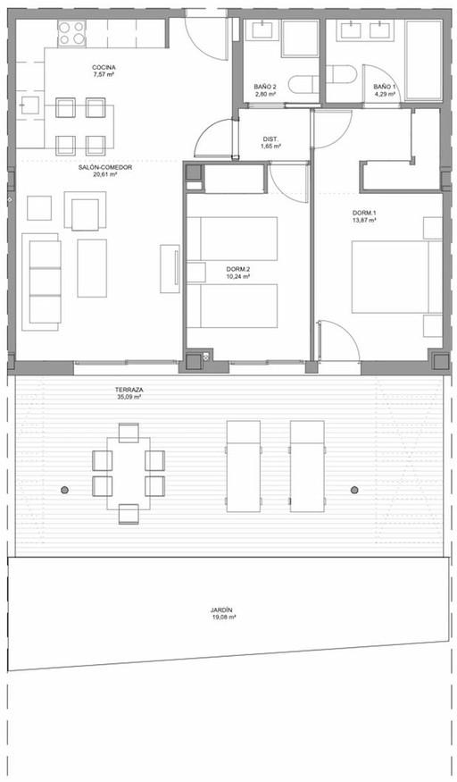 This 2-bedroom, 2-bathroom ground floor apartment enjoys a south-facing orientation and a prime position directly in front of the communal swimming pool. With a well-planned layout, including an open-plan kitchen, bright living spaces, and a private terrace with garden access, it is designed for both comfort and style.
