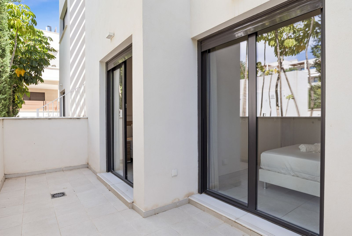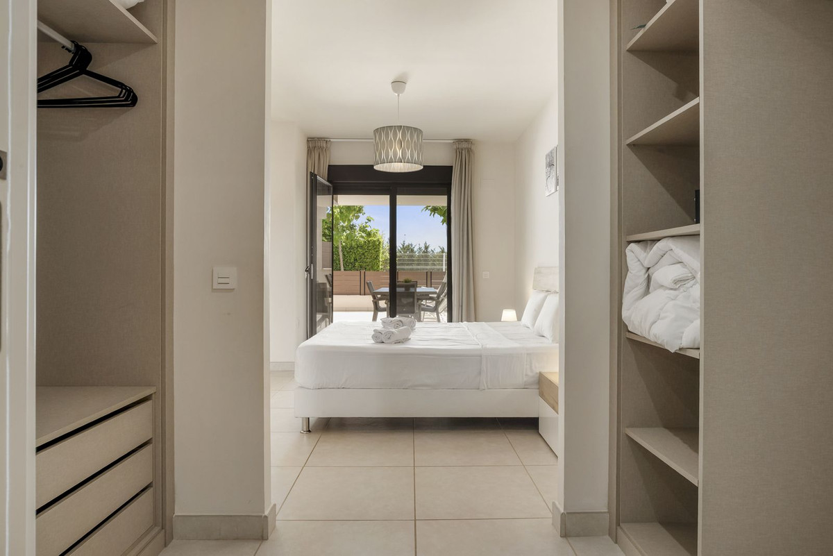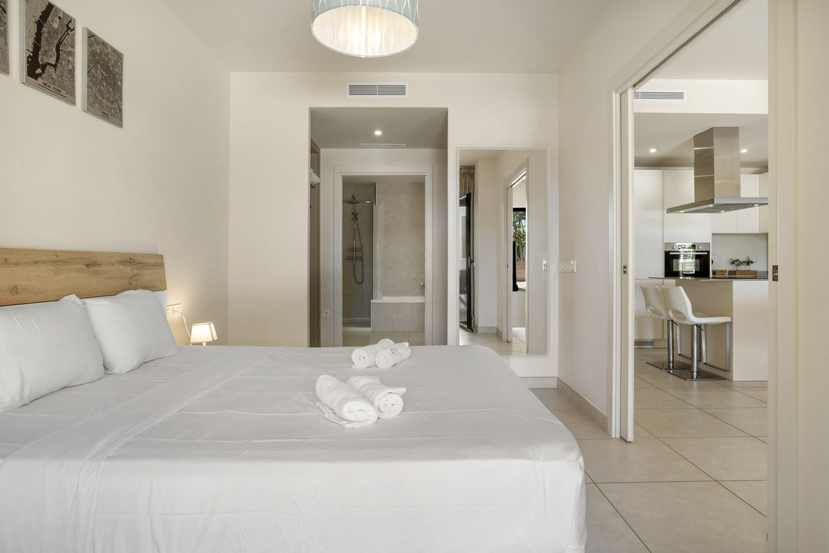 From the living room, you can access the master bedroom. A spacious bedroom with built-in wardrobes and a private luxury bathroom. From this bedroom, there is also access to the terrace.