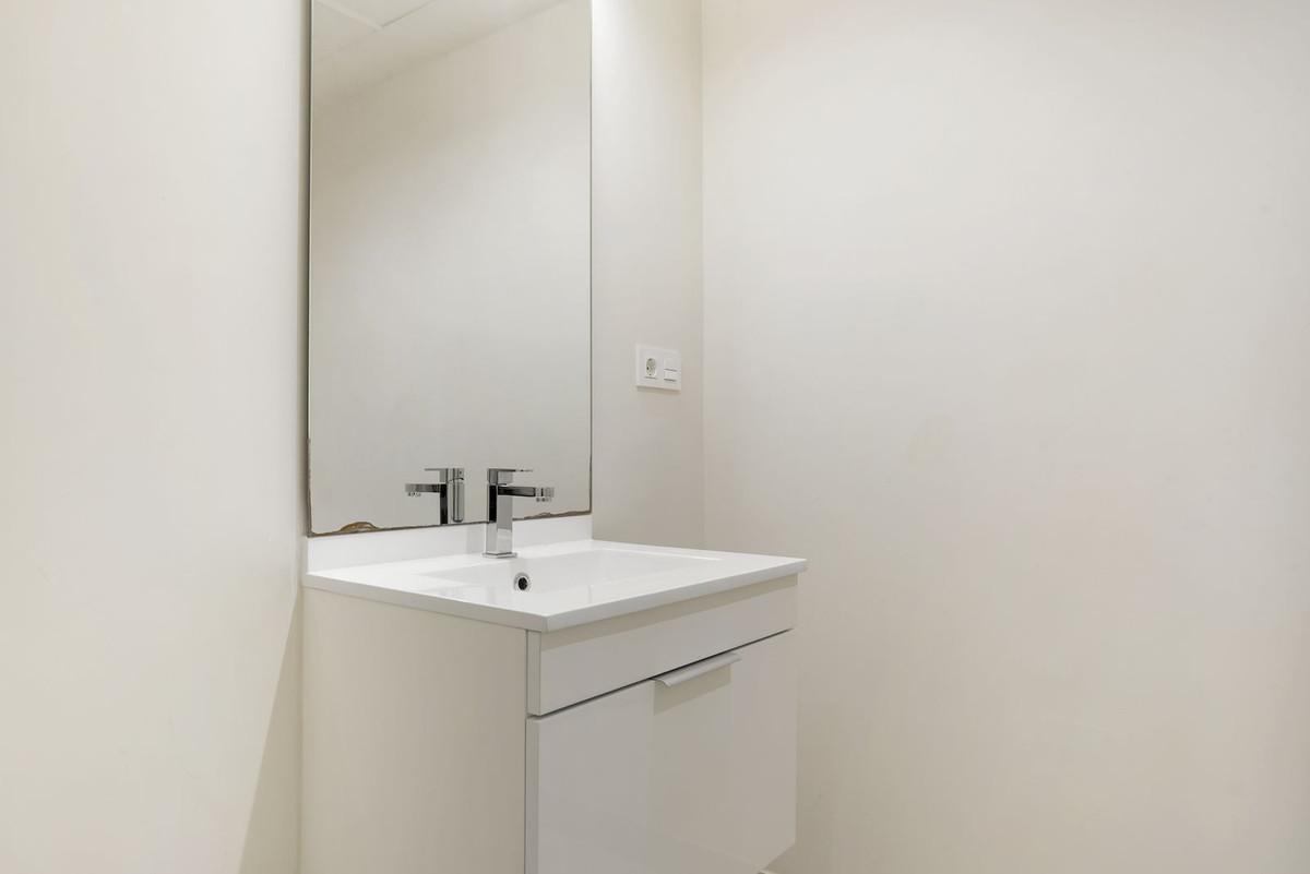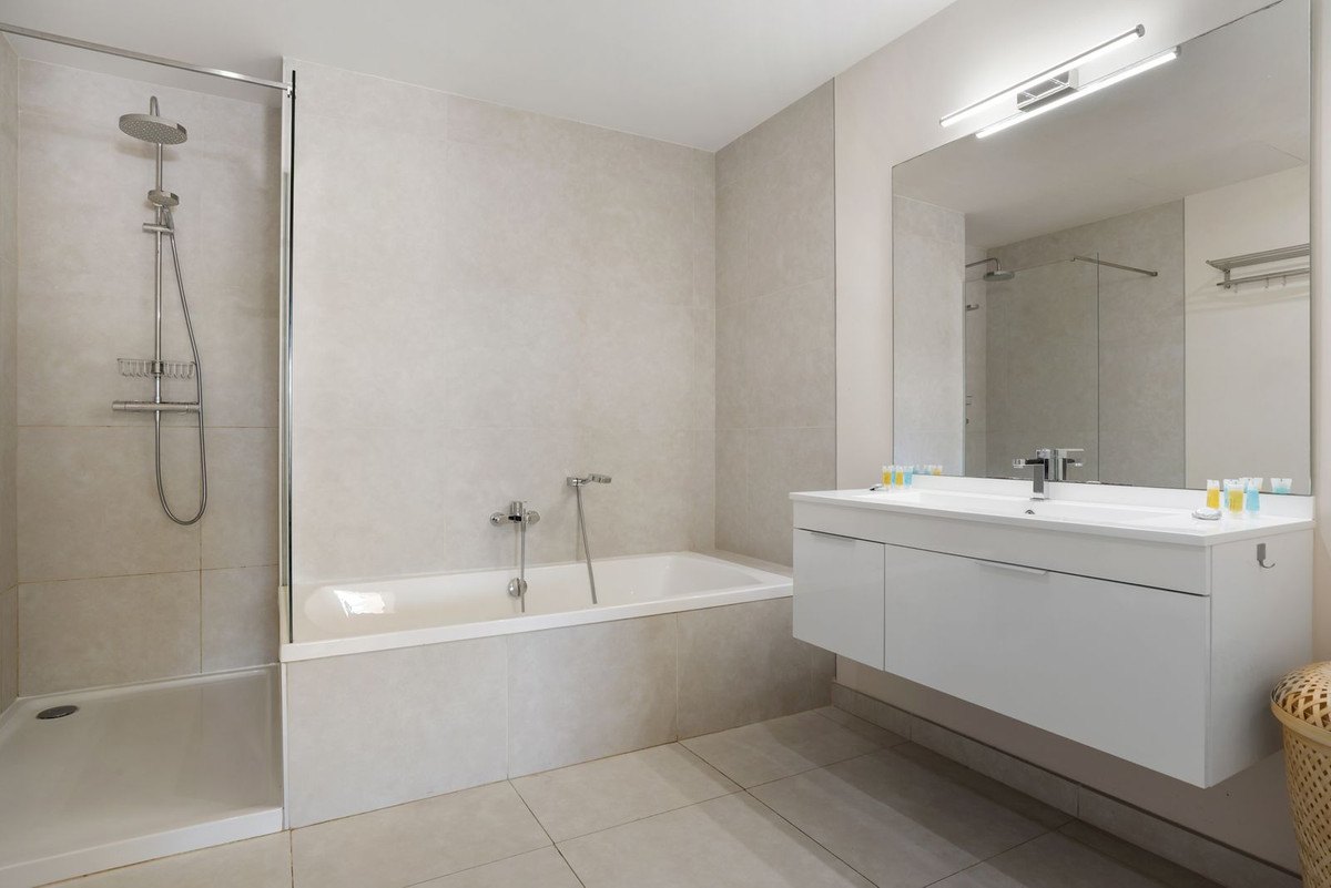 At the front of the apartment is the living room with a lovely open kitchen. From the living room, you can enter the terrace, and beautiful sliding doors that disappear into the wall make the terrace accessible.