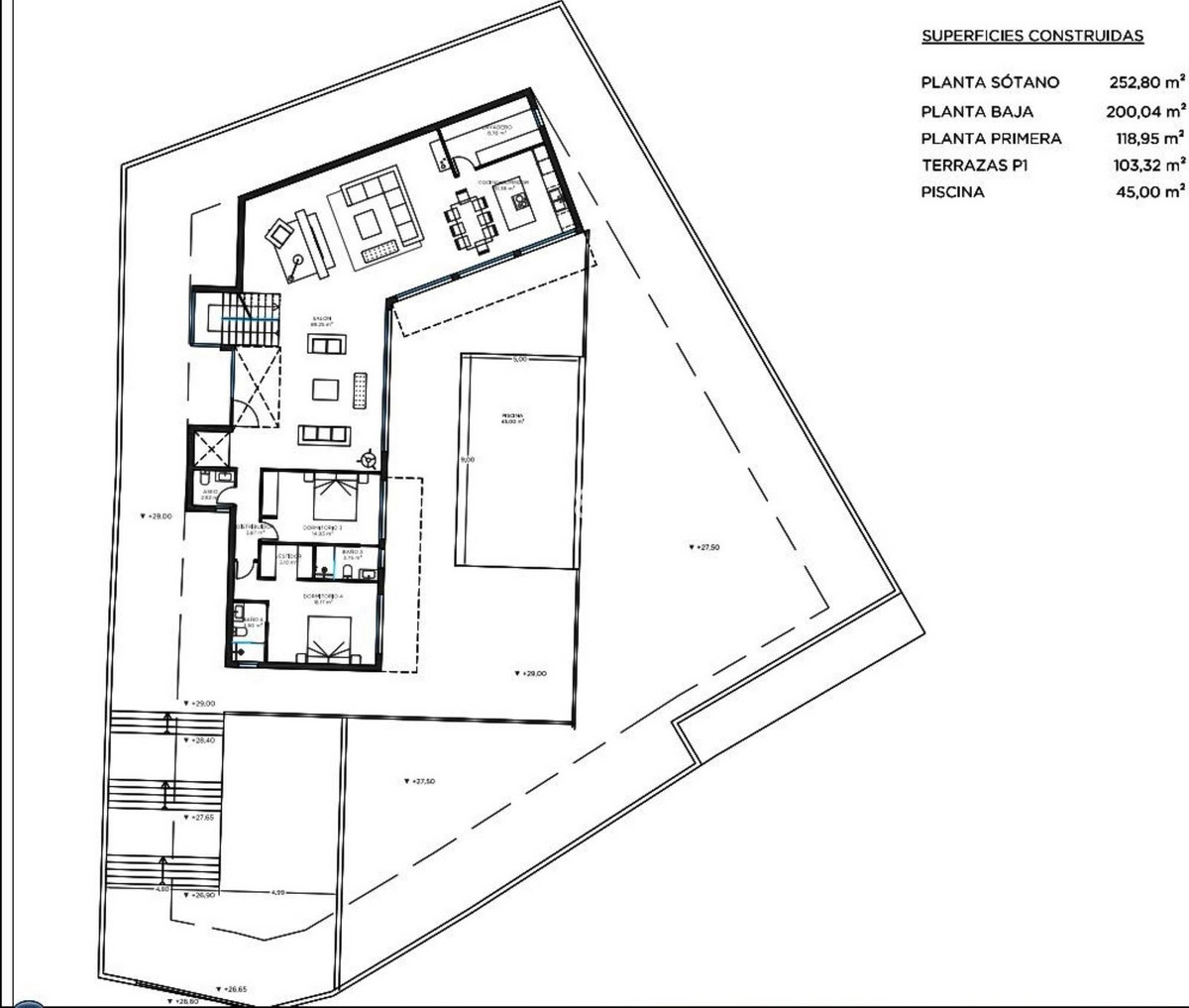 First floor with two large en-suite bedrooms, study and another full bathroom. In addition, a terrace of over 100 m² with spectacular sea and mountain views. Finally, the large basement of over 250 m² houses a spacious car park for several vehicles, a machinery room and a huge area that could be used to create a guest apartment, cinema, wine cellar, games room or whatever the new owner desires.