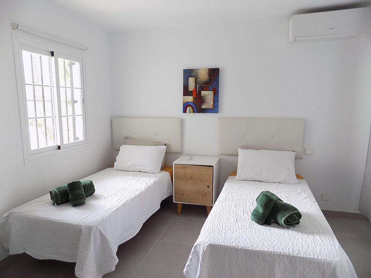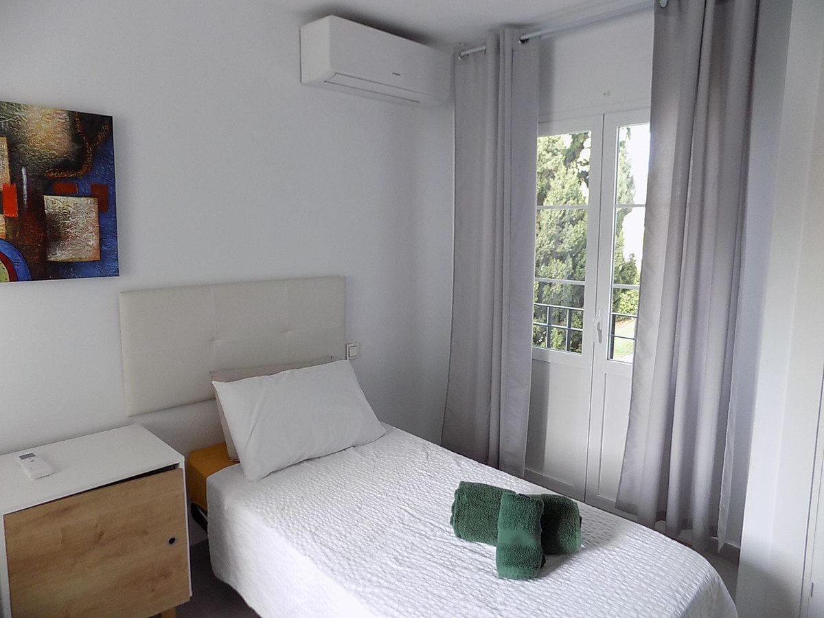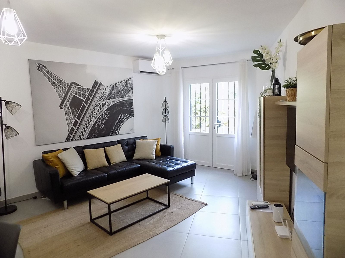 This beautifully renovated and show apartment quality townhouse is located in the prestigious Mijas Golf area within walking distance to all amenities and public transport. It is set in the tranquil gardens of a gated, secure community.There are two floors plus a large basement which has also been renovated to include a new bathroom, lounge and office (this could easily be a third bedroom if required). On the ground floor, there is a modern kitchen, hallway with guest toilet and a lounge/dining room area that exits onto the stunning community gardens. On the upper floor, there are two spacious double bedrooms and two modern bathrooms. The sale includes all furniture, fixtures and fittings. It is well located with easy access to shops, bars and restaurants. Just outside the urbanisation there is a bus stop that takes you to Fuengirola and Enterrios. There are two hotels close by; Hotel Tamisa and the luxury La Zambra Hotel. In addition,there are two 18 hole golf courses and a driving range next to the property that includes an excellent bar/restaurant which is open all day to the general public. The house is ideal for use as a holiday home (there is an existing touristic licence) or long/short term rental investment. 7 minutes to La Cala de Mijas. 5 minutes to Fuengirola. Viewings can be at short notice if required. Open to offers.