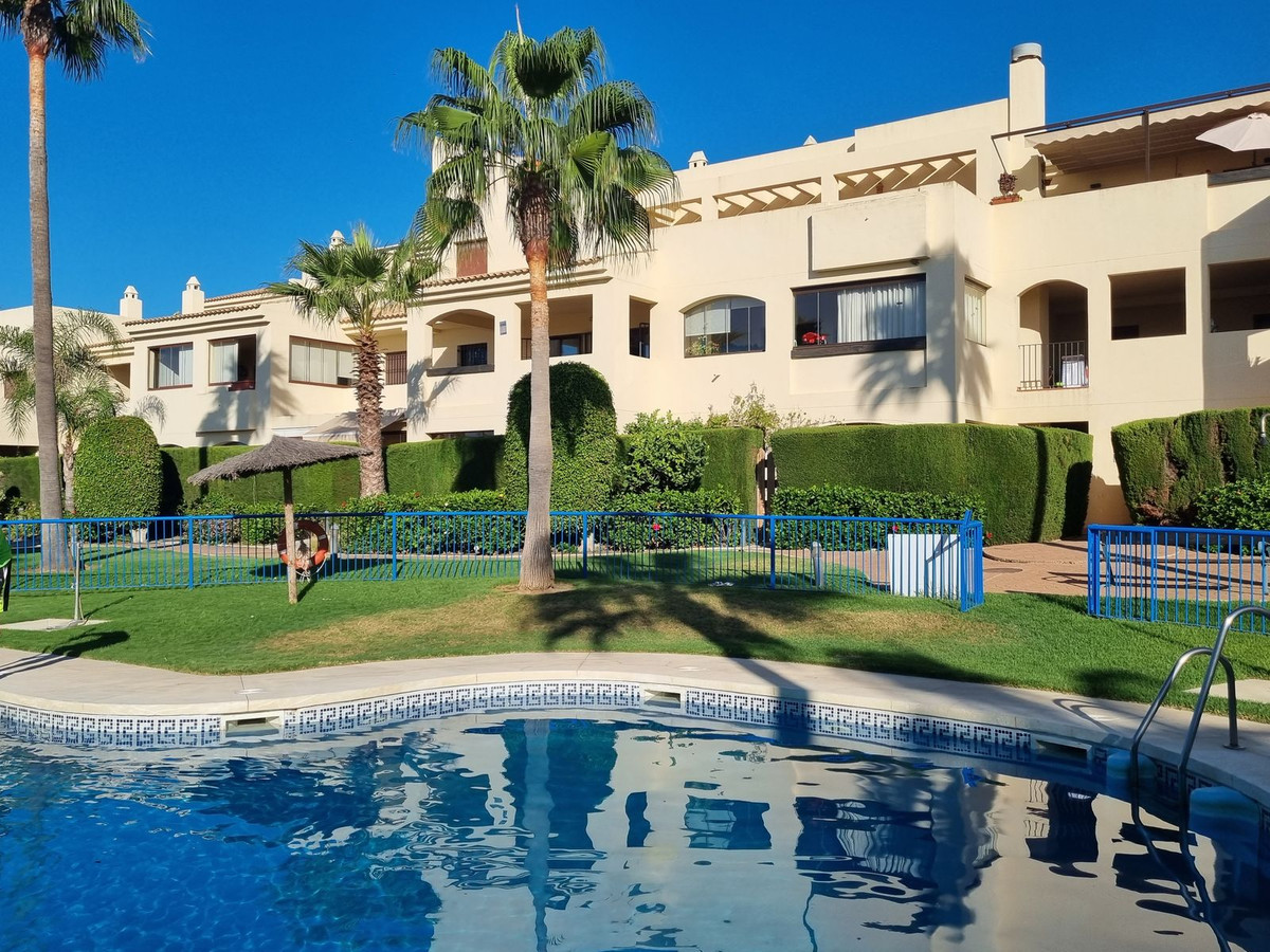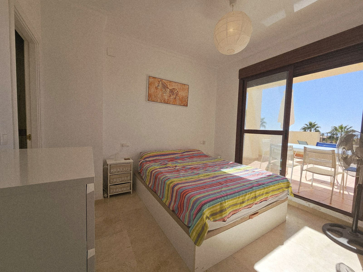 Used only as a holiday home, this apartment is in good condition and ready to move in to. The welcoming entrance hall leads to a fully fitted kitchen with charming golf views and a practical utility room. The living room/ dining room opens onto the large uncovered terrace, overlooking the swimming pools, gardens and the Mediterranean coast. The master bedroom, complete with en-suite bathroom, also has direct access to the terrace. Two additional bedrooms share a full family bathroom and all bedrooms are separated from the living area by a corridor, ensuring peace and quiet for family or guests.