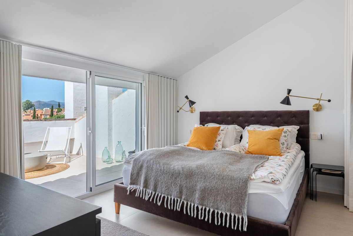 The spacious living room with dining area is bathed in natural light and opens onto a generous terrace where you can enjoy spectacular views of both the sea and the mountains. The kitchen is sleek and fully equipped, created for those who value style and functionality in perfect harmony. The property offers three bedrooms, one on the entrance level and two upstairs. The master bedroom features its own private bathroom and a stunning terrace with panoramic views over Nueva Andalucía and the Mediterranean – the ideal spot to enjoy the evening sun and let the day end with a breathtaking sunset.