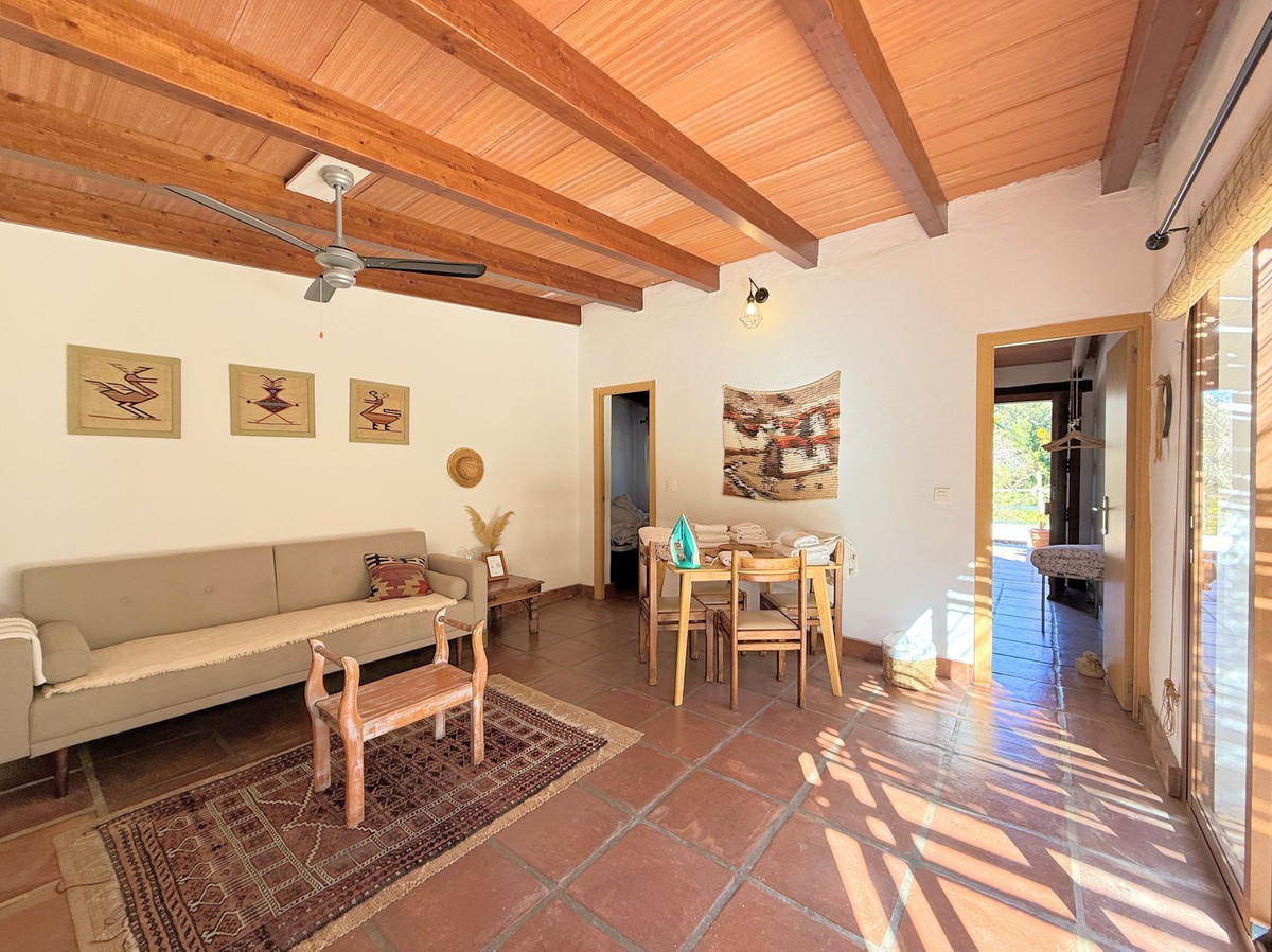 The main house in traditional Andalusian style with two floors, cozy living room with fireplace, high wooden beams, two bedrooms with en-suite bathroom and large terraces that lead directly to the garden and pool.