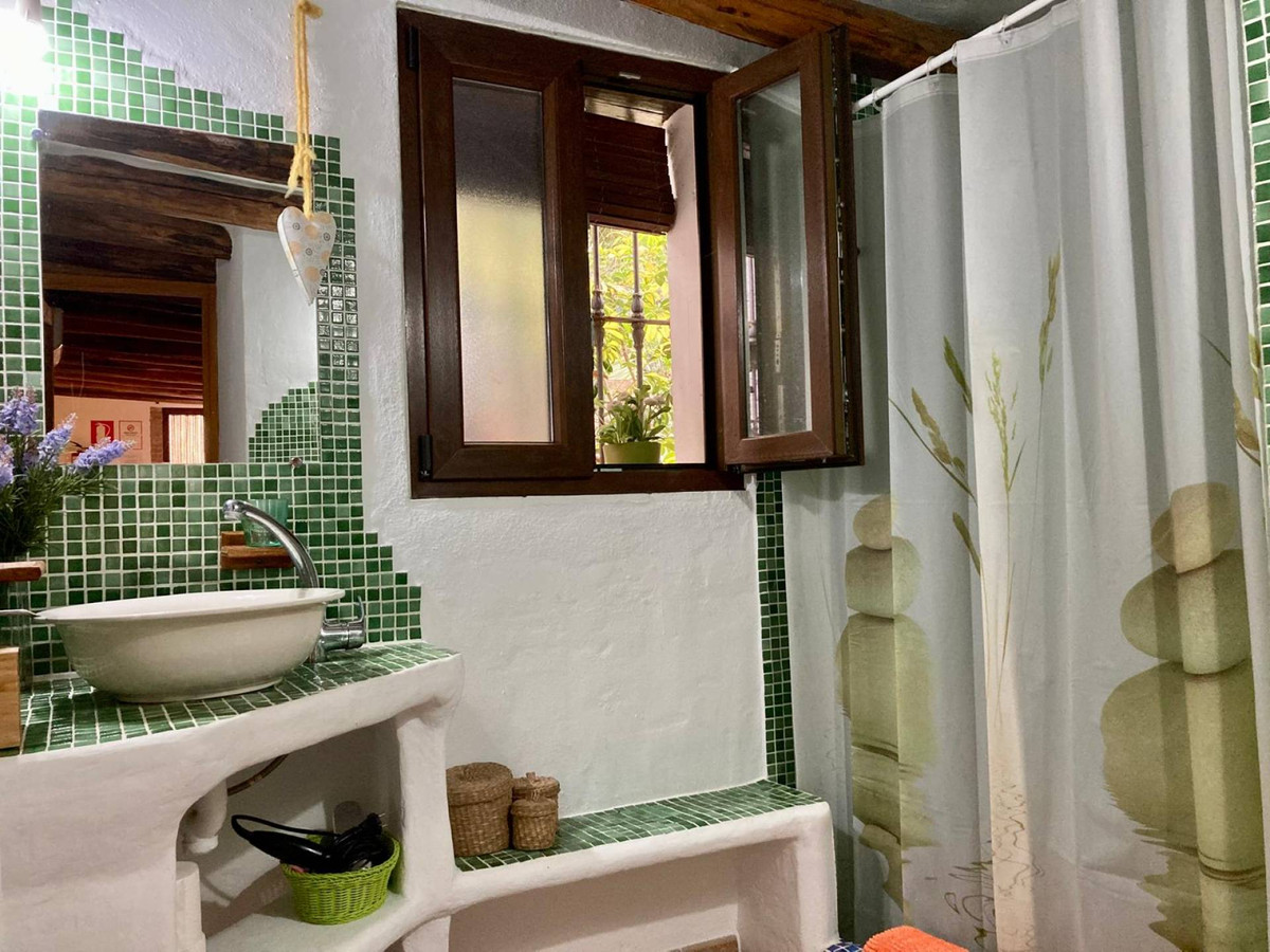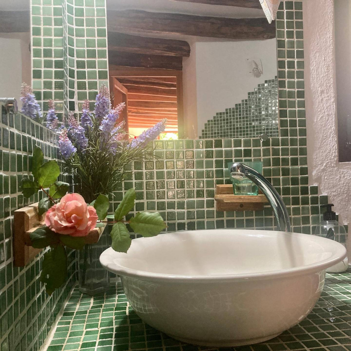 The private bathroom with shower with its green tiles is as fresh as the garden.