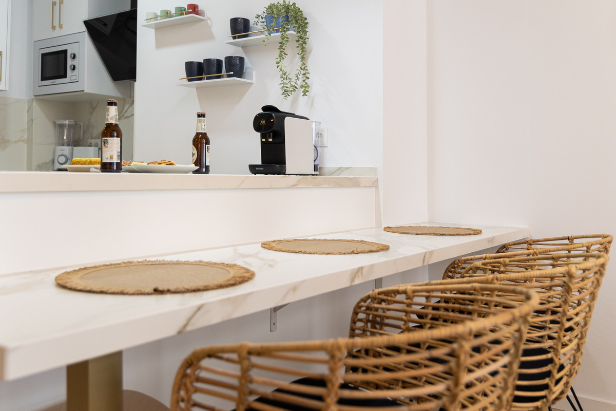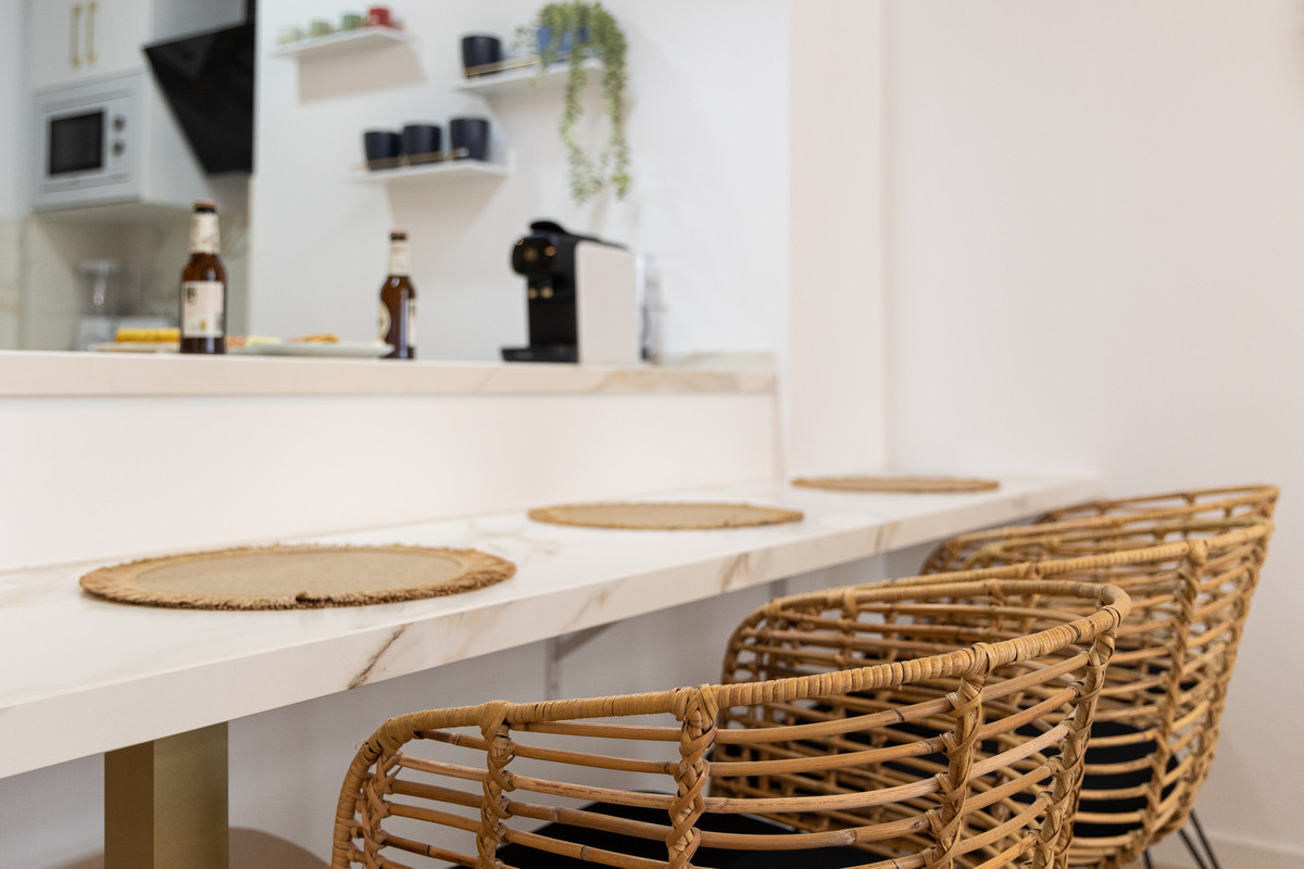 Our flat has one bedroom, a living room with an open-plan kitchen separated by a beautiful island that doubles as a dining table, air conditioning and a south-facing aspect that provides it with a special light, making it cosy and functional.