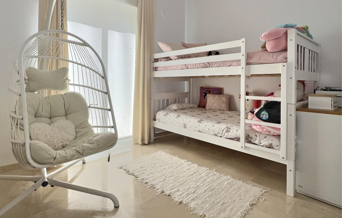 The master bedroom and living room open onto a stunning covered terrace, fully enclosed with glass curtains, connecting to the private garden and communal areas. West-facing, it enjoys beautiful countryside views and breathtaking sunsets. The other two bedrooms share an additional terrace facing east, perfect for the morning sun.