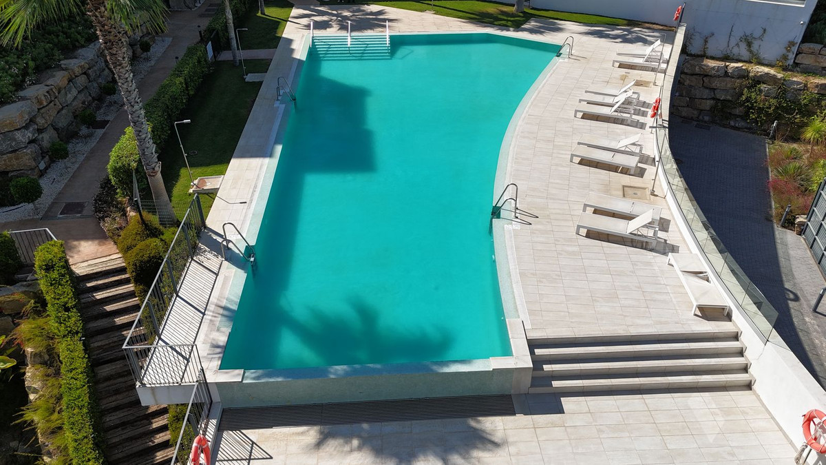 This spacious apartment boasts 125 m² of built living space, an impressive 51 m² sun-drenched terrace, and a private garden of 95 m², beautifully landscaped with a lawn maintained by the community. Thanks to its corner position and oversized windows, it enjoys abundant natural light and breathtaking views of the sea, the Sierra Bermeja mountains, and the swimming pool.