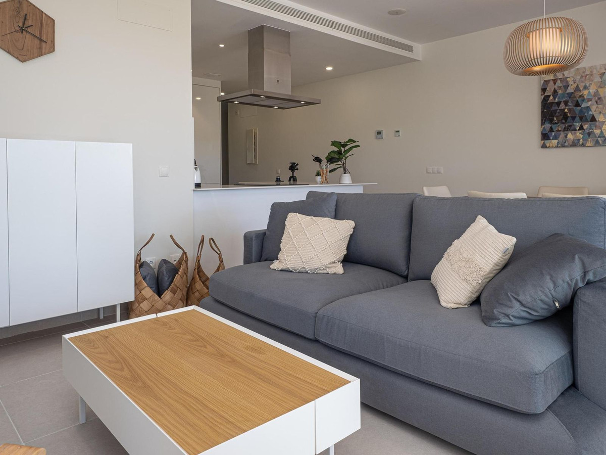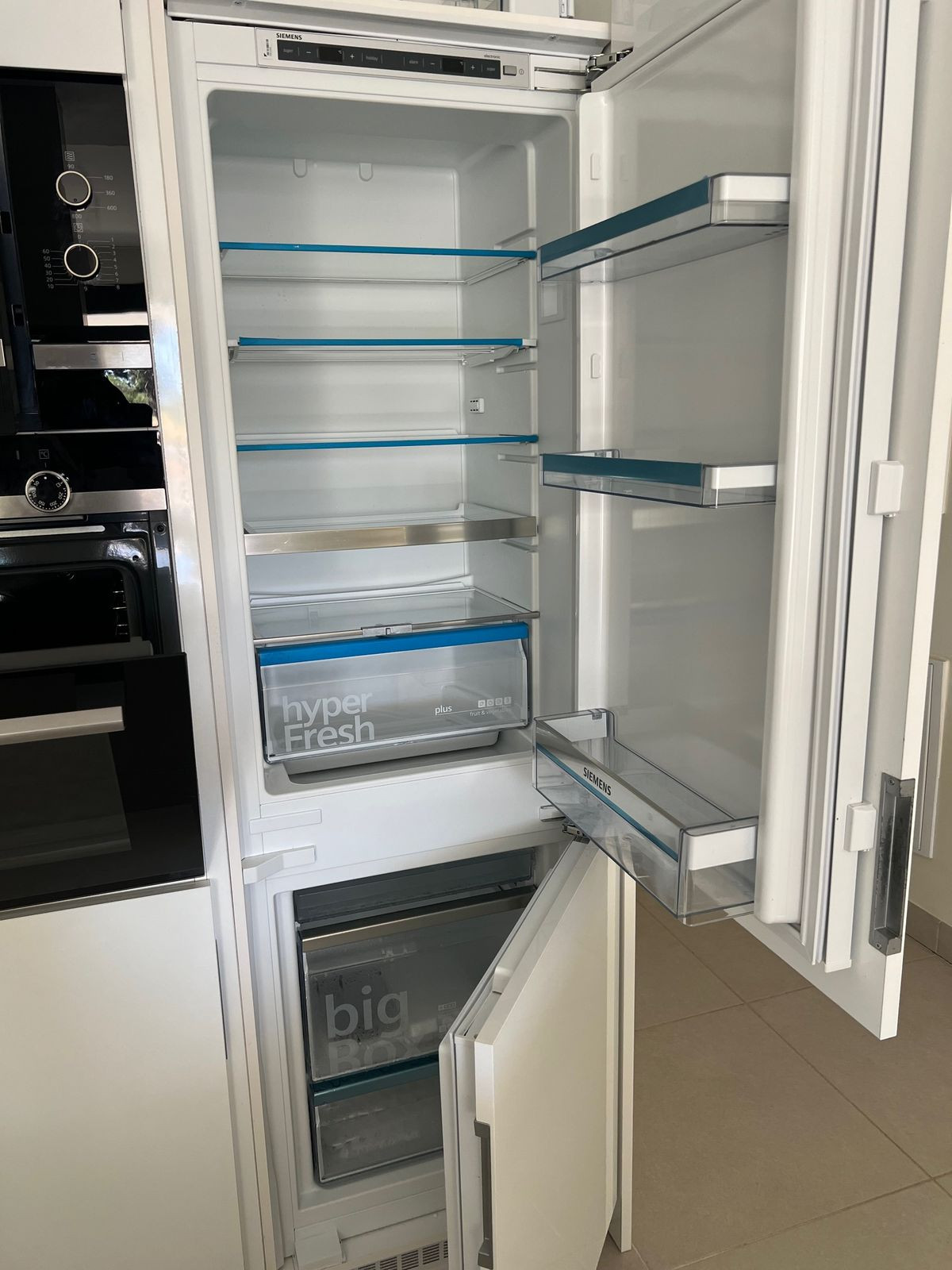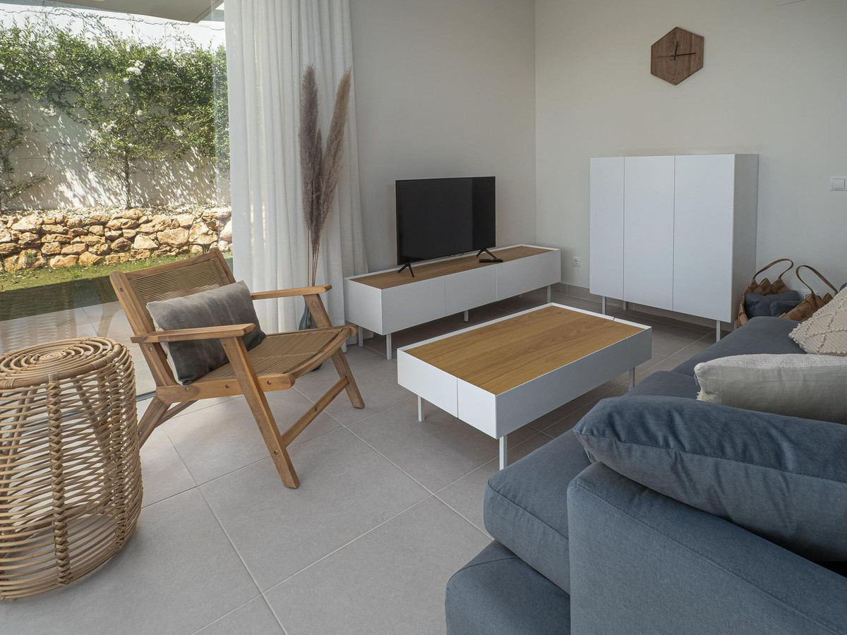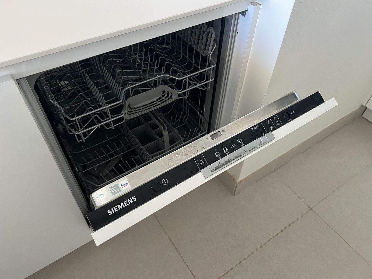 Inside, the apartment is tastefully decorated and fully furnished, featuring high-quality finishes throughout. The open-plan kitchen with a striking central island is fitted with top-quality Siemens A+ appliances. The bright and airy living and dining area flows seamlessly to the terrace and garden through three large sliding doors – blending indoor and outdoor living in true Mediterranean style.