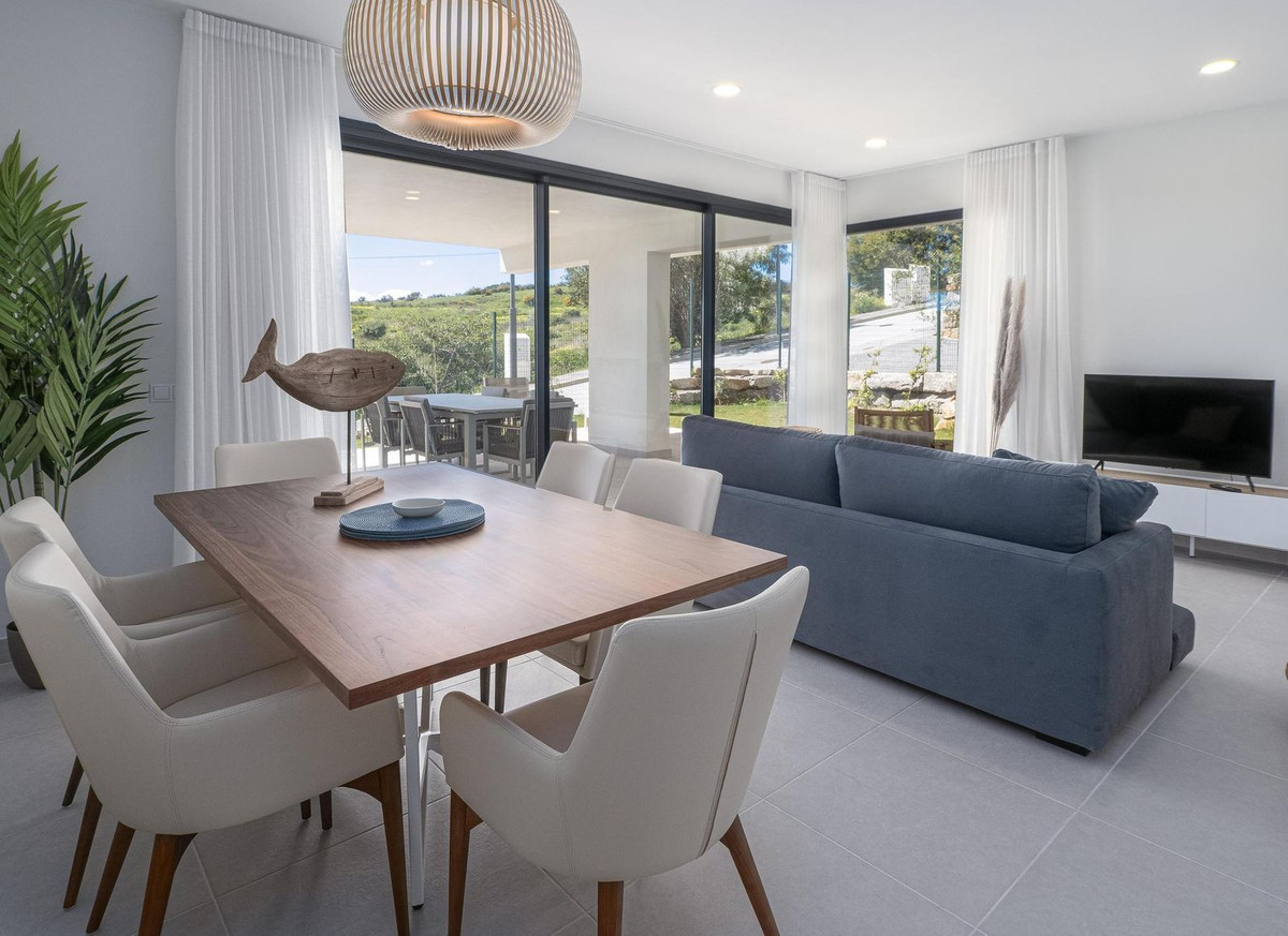 The master bedroom comes with a private ensuite bathroom with walk-in shower and built-in wardrobes, and offers direct views of the terrace and garden. The two additional bedrooms, both with fitted wardrobes and beautiful views of the Sierra Bermeja mountains and pool, share a stylish second bathroom with bathtub. A separate utility room next to the kitchen houses the washing machine and provides additional storage space.