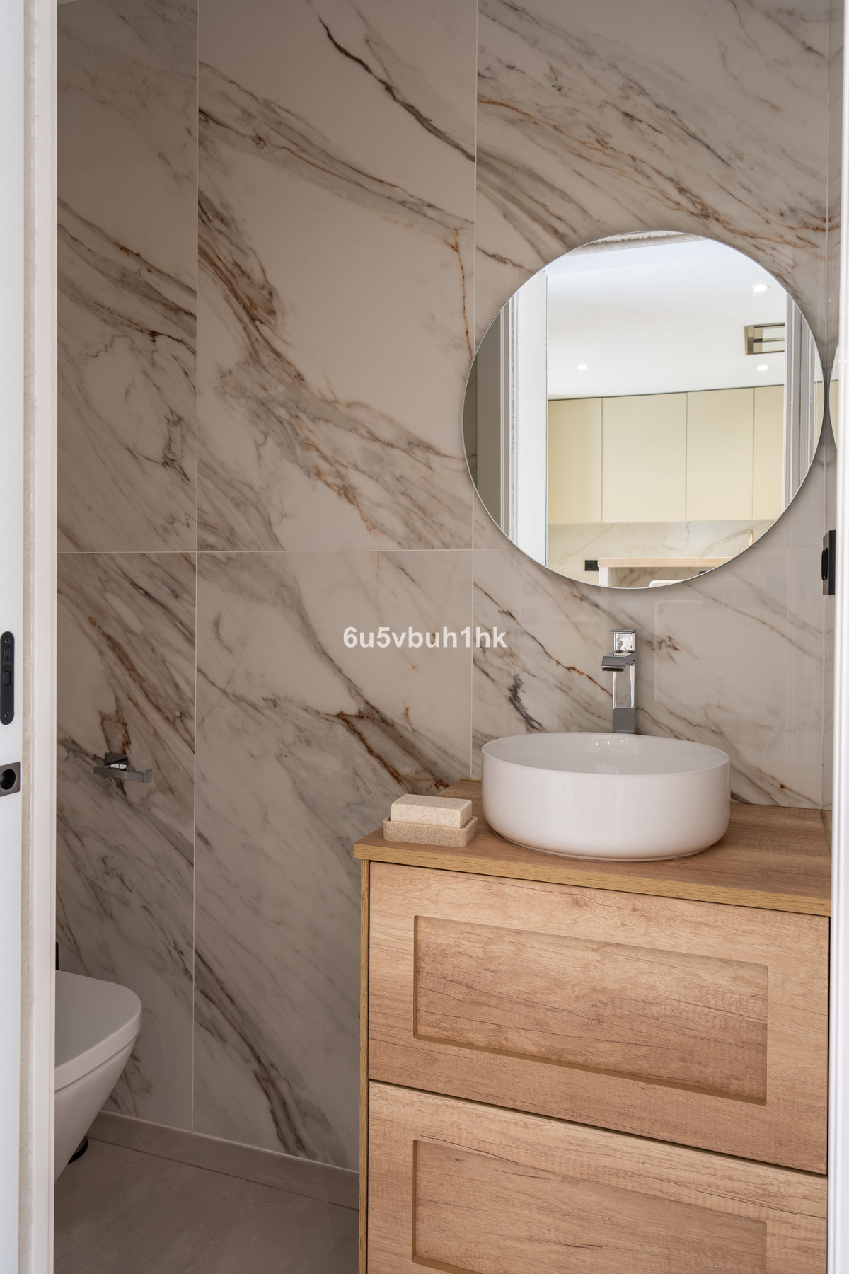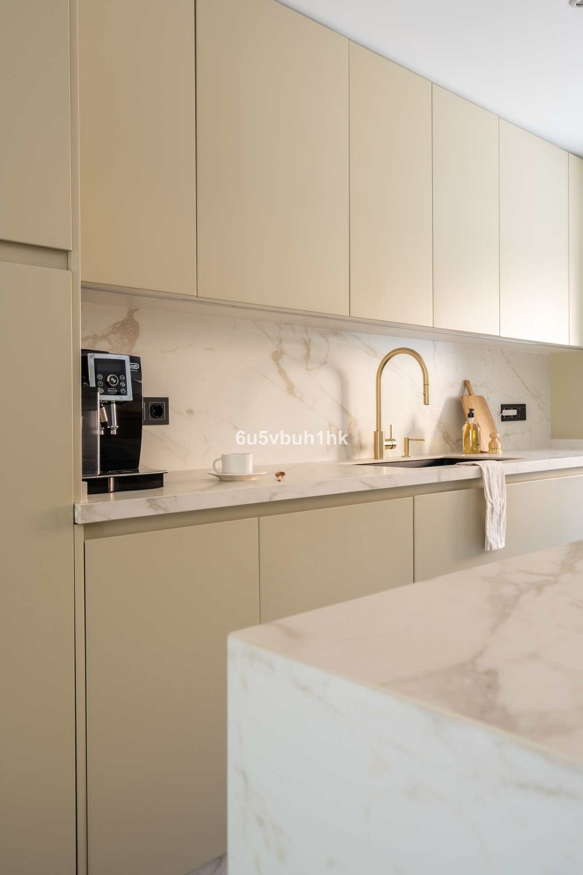 The impressive front door leads into an open plan kitchen and living room area which flows out onto a private patio with direct views to the sea and a gate to the community area. The kitchen is fitted with modern appliances and is ample in size with plenty of storage space.
