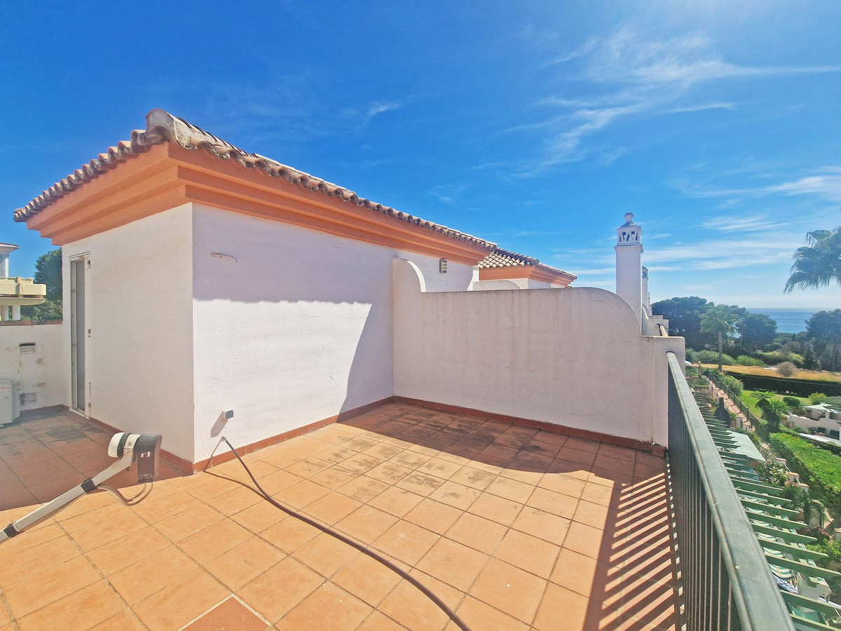 The upper floor comprises two bedrooms: the master suite with en-suite bathroom and inspiring sea and pool views, and a second bedroom served by a family bathroom at the rear of the house. From here, a staircase leads to the rooftop solarium, where panoramic views stretch across Marbella’s coastline to the iconic La Concha mountain. With its south-west orientation, this is an ideal space for sunsets, entertaining, or quiet evenings. A practical laundry area is also located on this level.