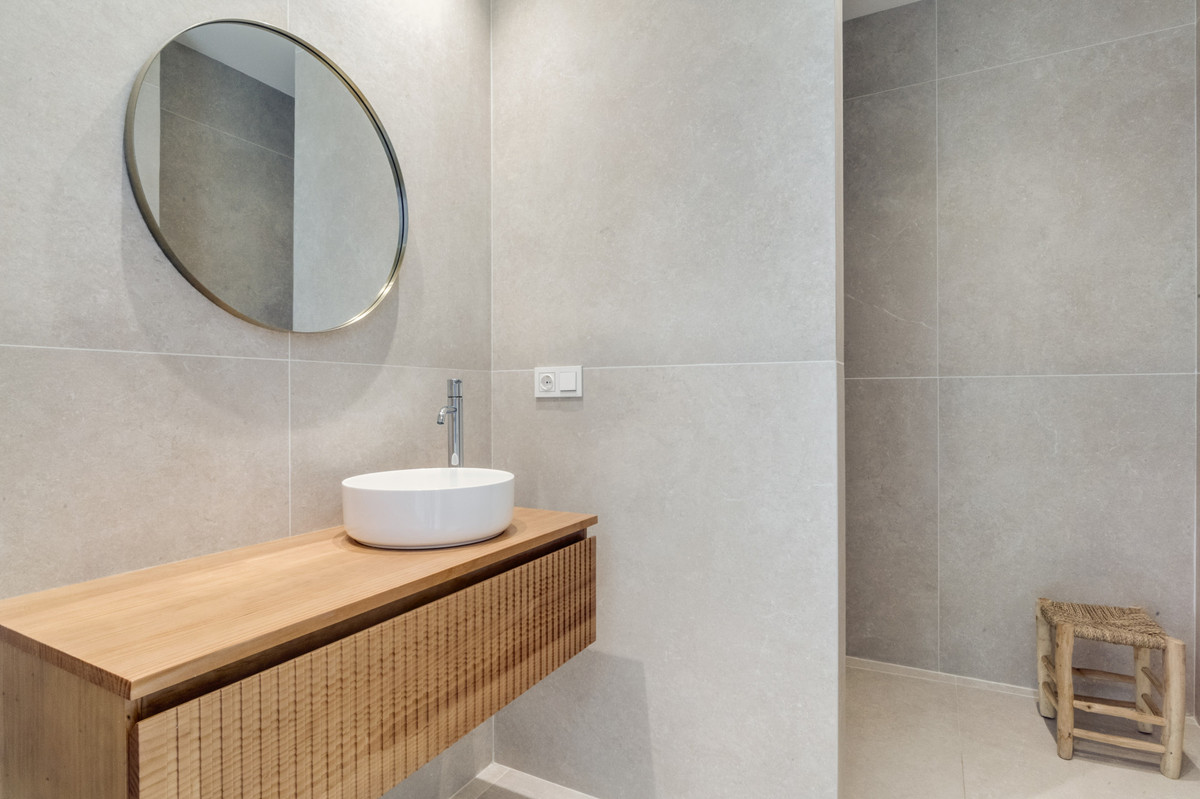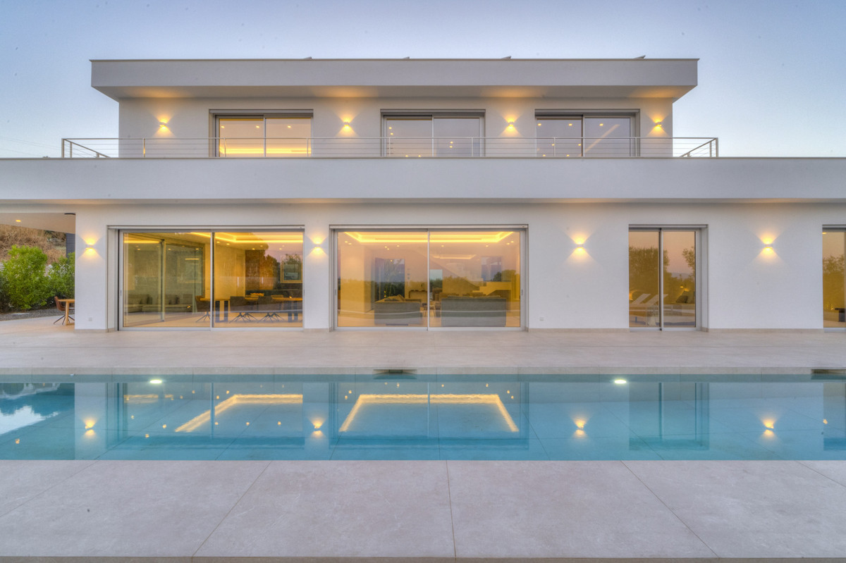 For outdoor living, the property excels with its expansive terraces perfect for al fresco dining, a private pool with views across the lush garden and dramatic mountains beyond, and an outdoor shower for added convenience. Smart home systems, including surveillance cameras, video entrance and remote-controlled gate, provide security. The villa is also equipped with underfloor heating throughout,  air conditioning units, solar panels, automatic irrigation, and fibre optic internet, combining comfort and ecological sensitivity.