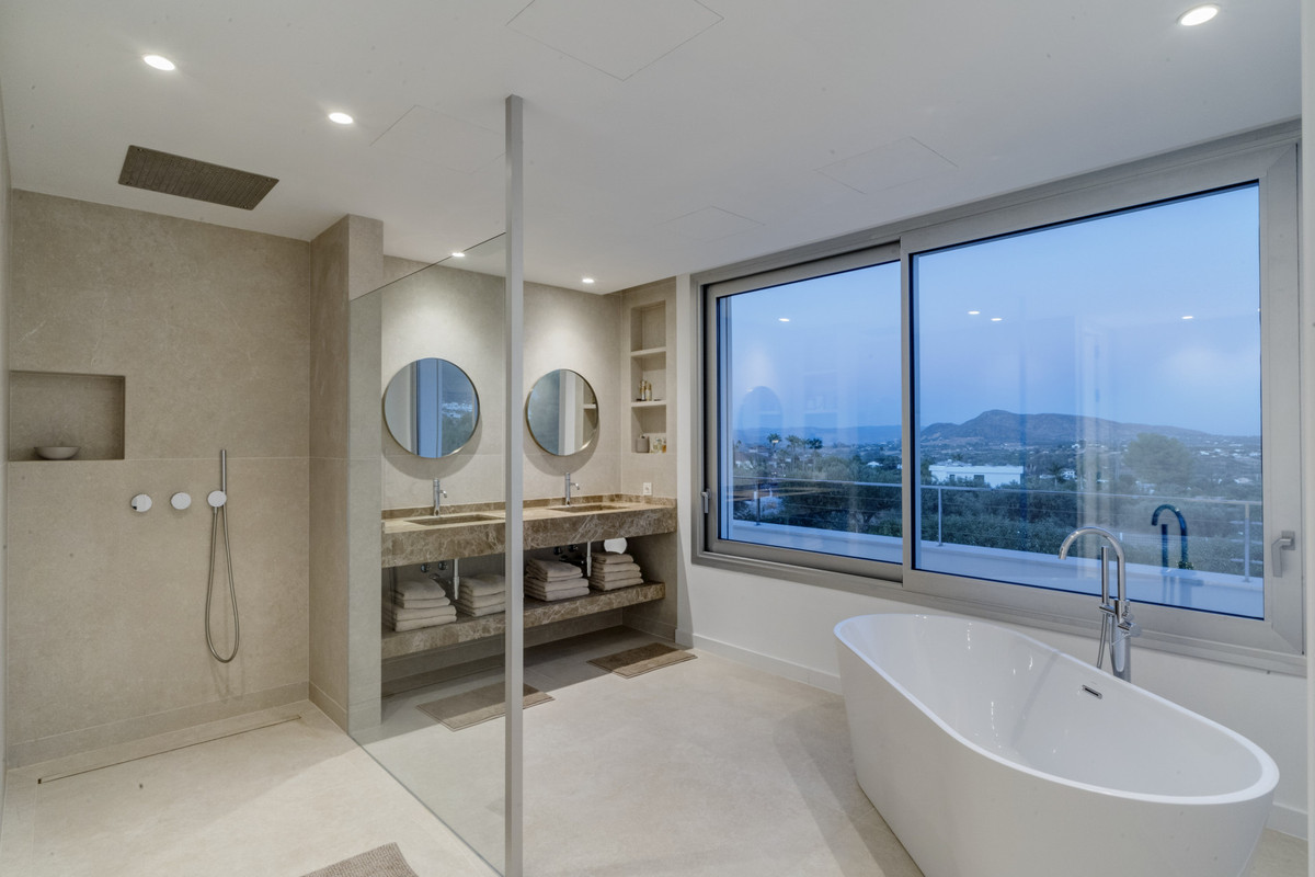 The master suite offers a tranquil oasis, generously proportioned, has it's walk-in wardrobe and and elegant bathroom with stand in shower. Imagine sinking into a warm, soothing bath as natural light pours in through expansive picture windows. From the comfort of your elegant soaking tub, you’re treated to sweeping views of mountains. As the world unfolds outside, you're wrapped in serene stillness — a perfect blend of privacy and connection with nature.