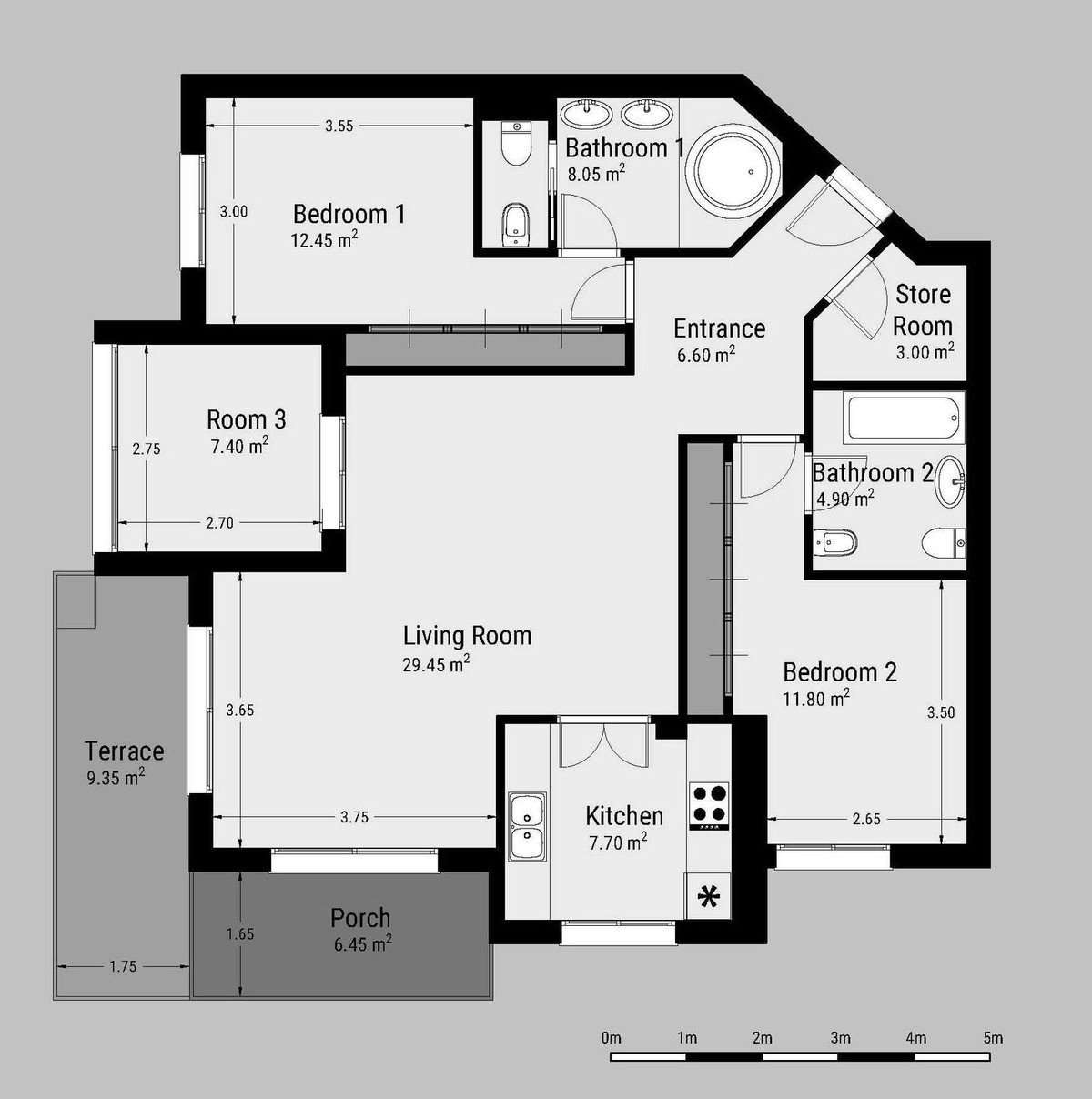 The property features two terraces: one open and sun-drenched, and another enclosed with glass, facing east. Inside, there are two generous double bedrooms, along with a third smaller bedroom converted from a former terrace. The apartment also includes a fully fitted kitchen, a large living and dining area, and a handy storage room.