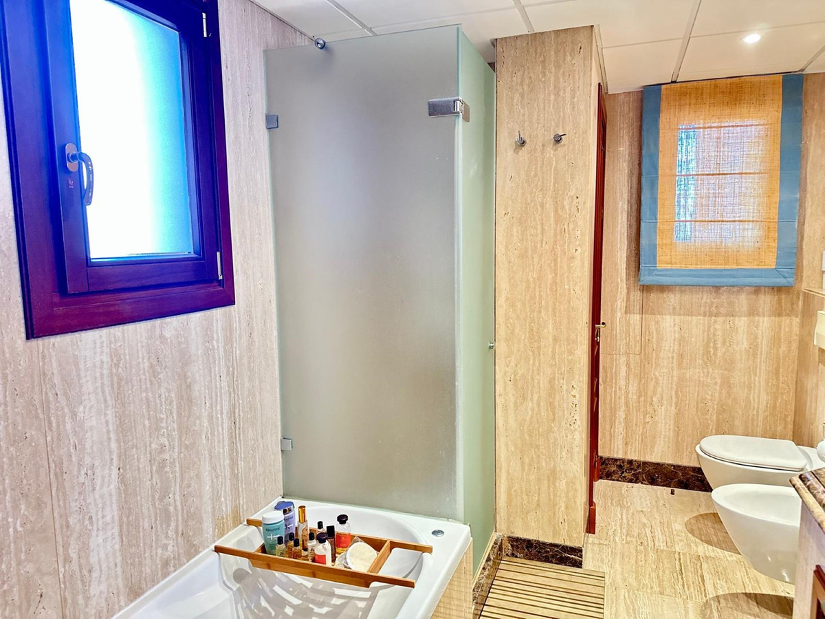 The penthouse is offered fully furnished and features a fully fitted and equipped kitchen, marble floors, and a spacious living and dining area that seamlessly connects to the terrace. Modern comforts include air conditioning, underfloor heating in the bathrooms, double glazing, and security shutters, ensuring a pleasant living environment year-round.