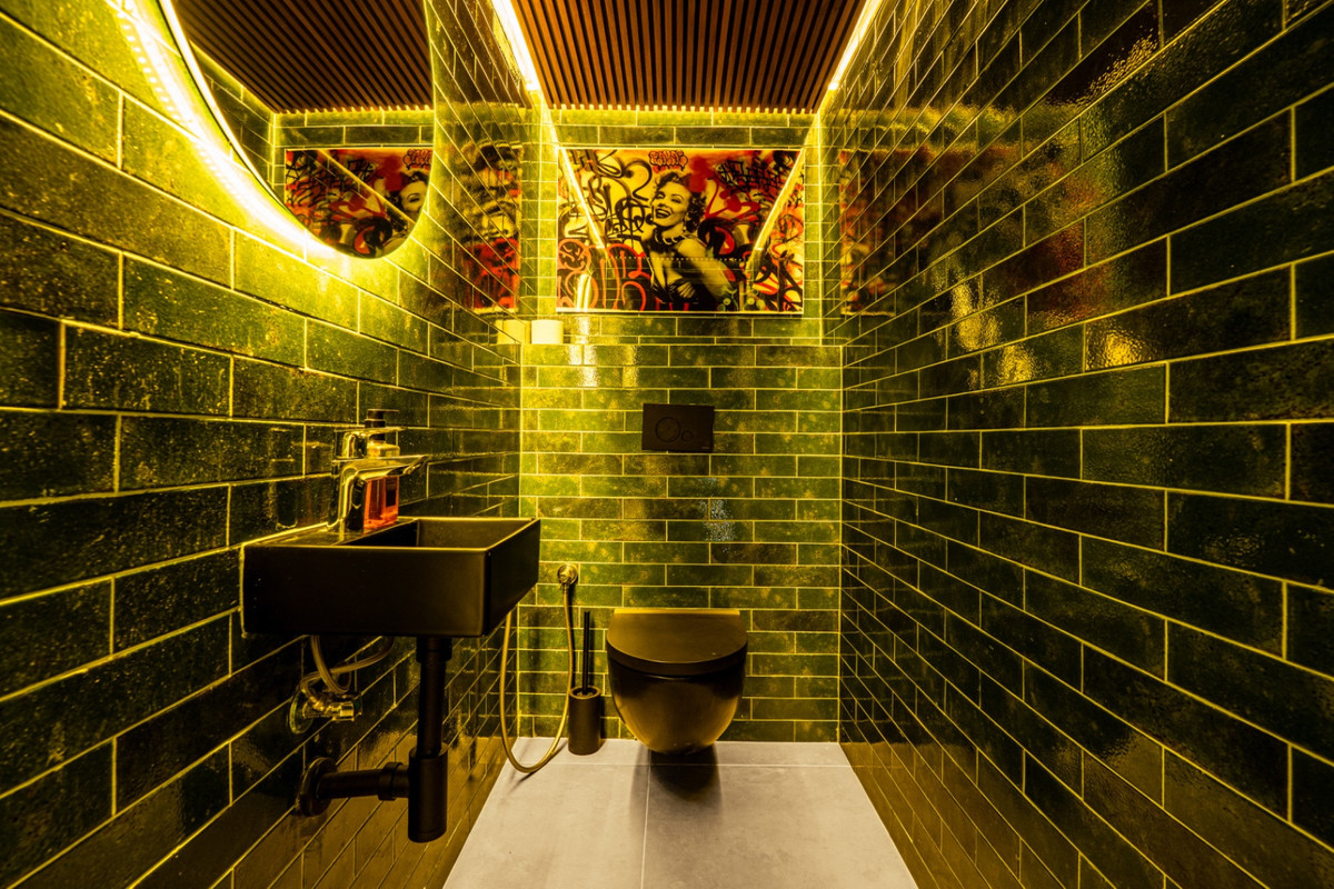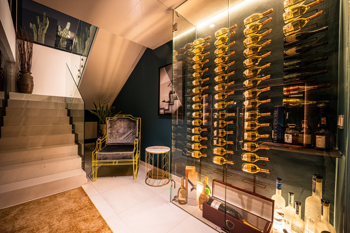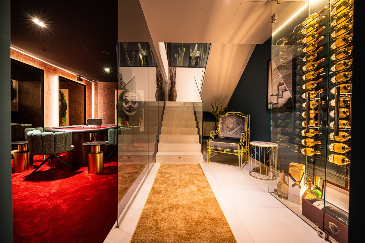 The villa has two guest bedrooms on the main floor, each with en-suite bathrooms and garden views. Upstairs, the master suite offers dual dressing rooms, a private office, and a large bathroom with a free-standing bathtub. The suite opens to a terrace with sweeping views. Another en-suite bedroom completes the upper floor. The basement level includes a private gym, cinema, wine cellar, and entertainment spaces, giving you everything you need for both relaxation and leisure.