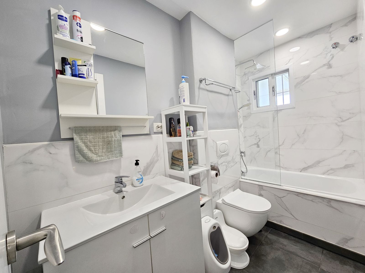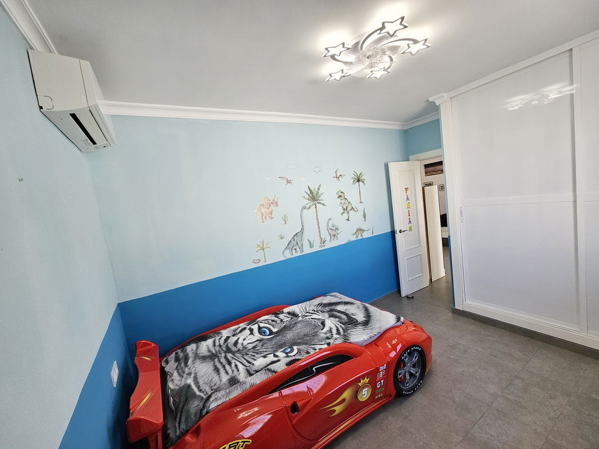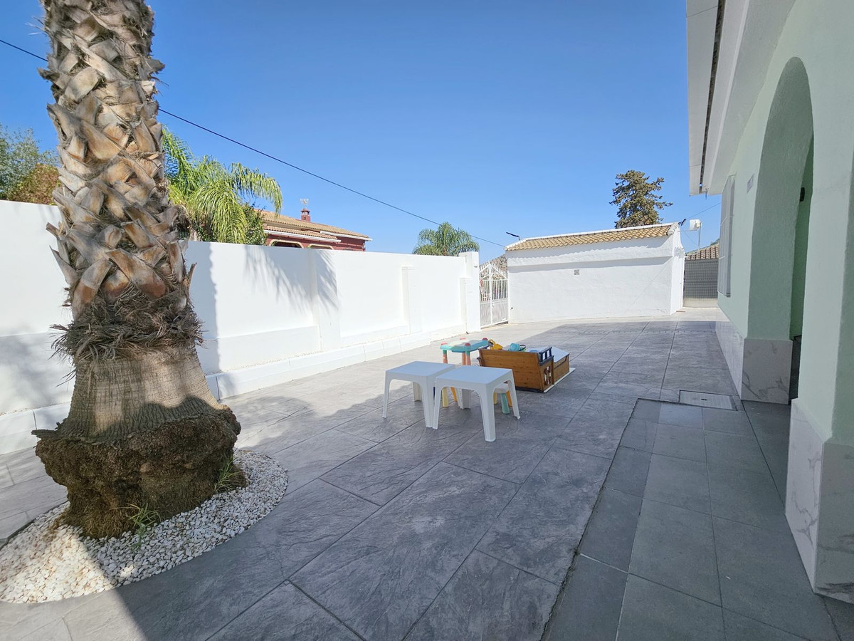 The villa is arranged on one level and comprises two bedrooms and two bathrooms. Inside, you’ll find a bright, modern interior with an open-plan layout and a brand-new fitted kitchen. Natural light fills the home, creating a spacious and airy feel throughout. The property can be accessed from both the front and the rear. Entering through the main door, you step into a generous lounge and dining area leading to the kitchen. Off the lounge is the first double bedroom, currently used as a child’s room, complete with fitted wardrobes and ample space. A short hallway, with additional storage wardrobes, connects to the master bedroom—a large, comfortable space with fitted wardrobes and a stylish en-suite bathroom featuring a walk-in shower. Adjacent to the master is the family bathroom, fitted with both bath and shower. Both bathrooms have been recently renovated to a very high standard.